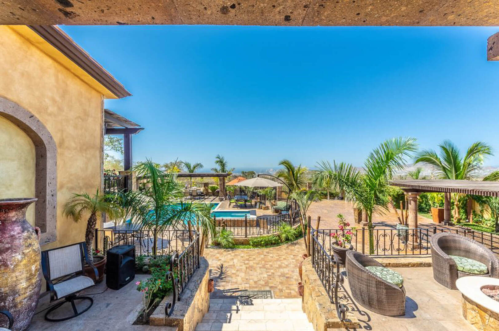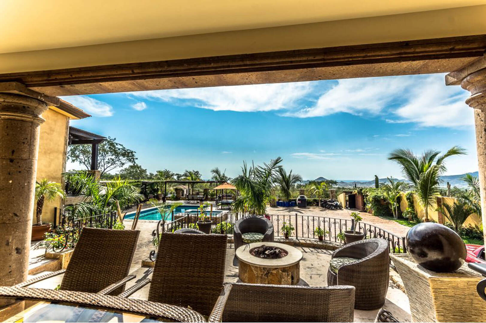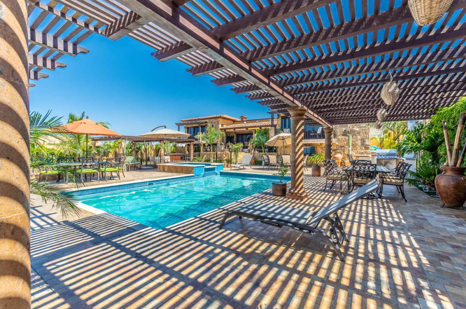 The outdoor amenities do not end at an additional dining area with seating for up to 8 guests. As well as plenty of other seating areas, Villa Finca del Tezal boasts a spacious outdoor swimming pool and a Jacuzzi that can accommodate 12, a gas and charcoal grill, outdoor TV, Palapa and a grand outdoor fire pit. All you would ever want for the ideal Cabo escape is here at Villa Finca del Tezal!