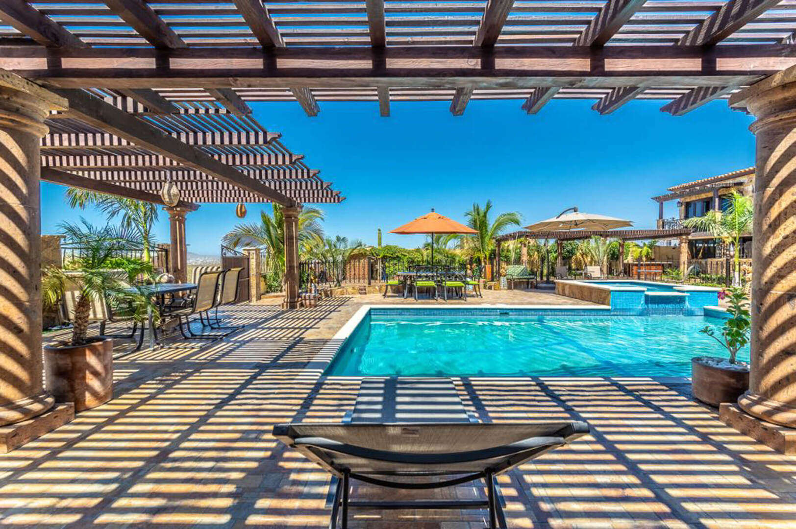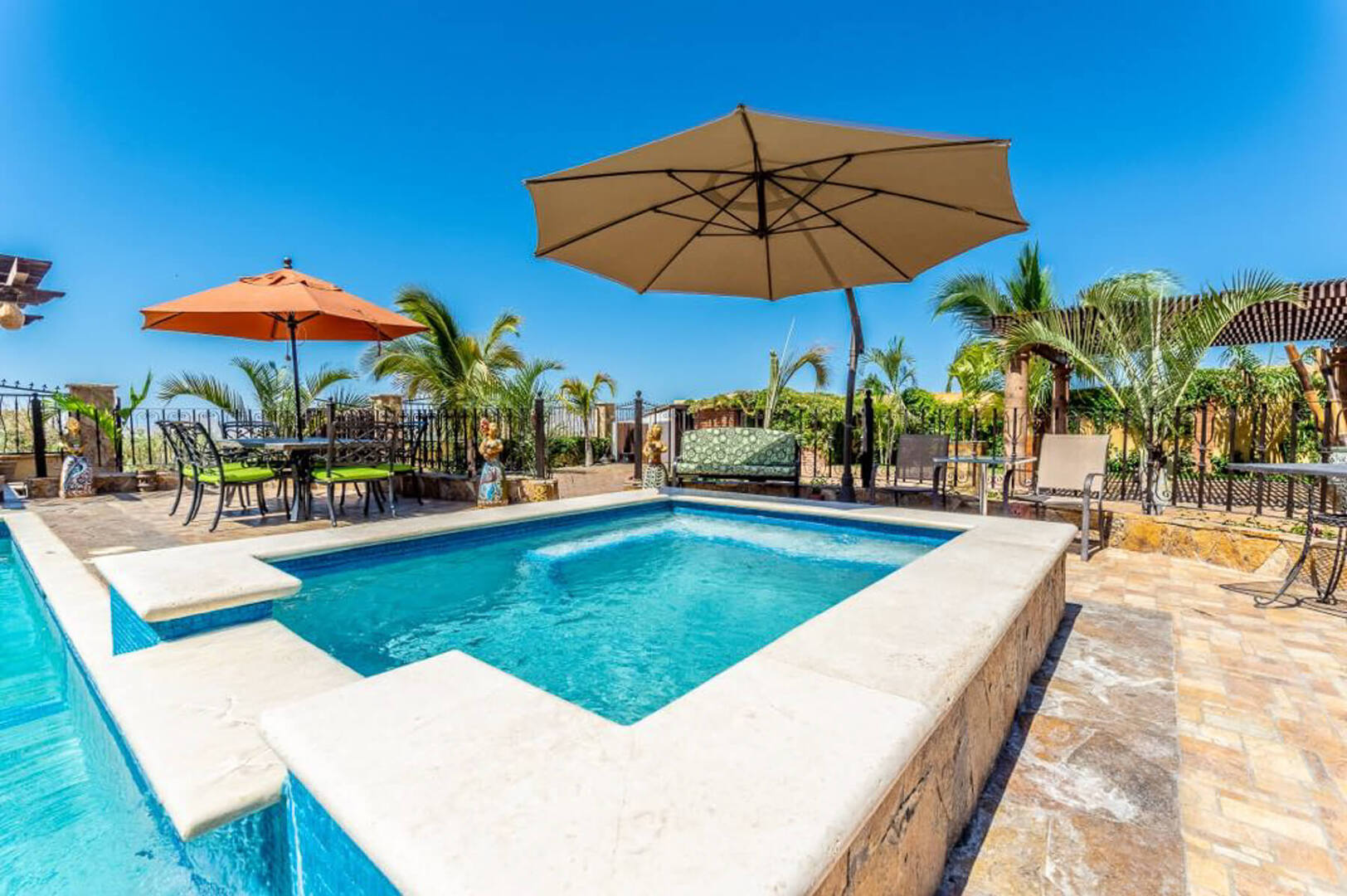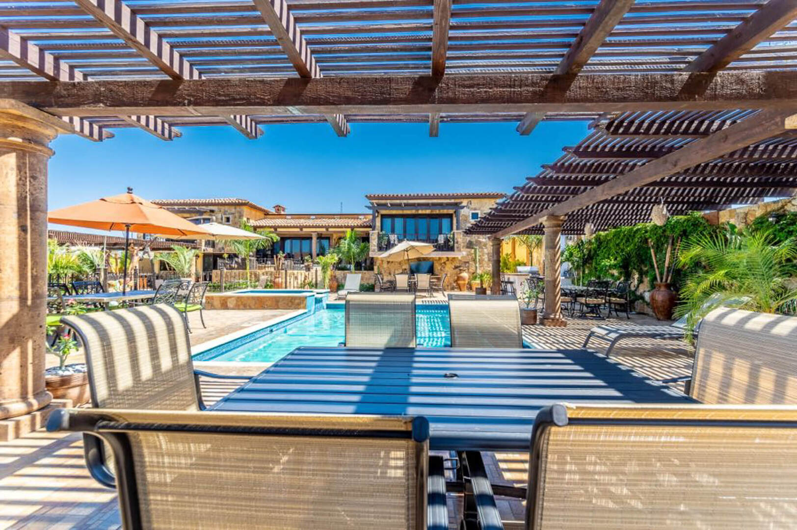 The outdoor amenities do not end at an additional dining area with seating for up to 8 guests. As well as plenty of other seating areas, Villa Finca del Tezal boasts a spacious outdoor swimming pool and a Jacuzzi that can accommodate 12, a gas and charcoal grill, outdoor TV, Palapa and a grand outdoor fire pit. All you would ever want for the ideal Cabo escape is here at Villa Finca del Tezal!