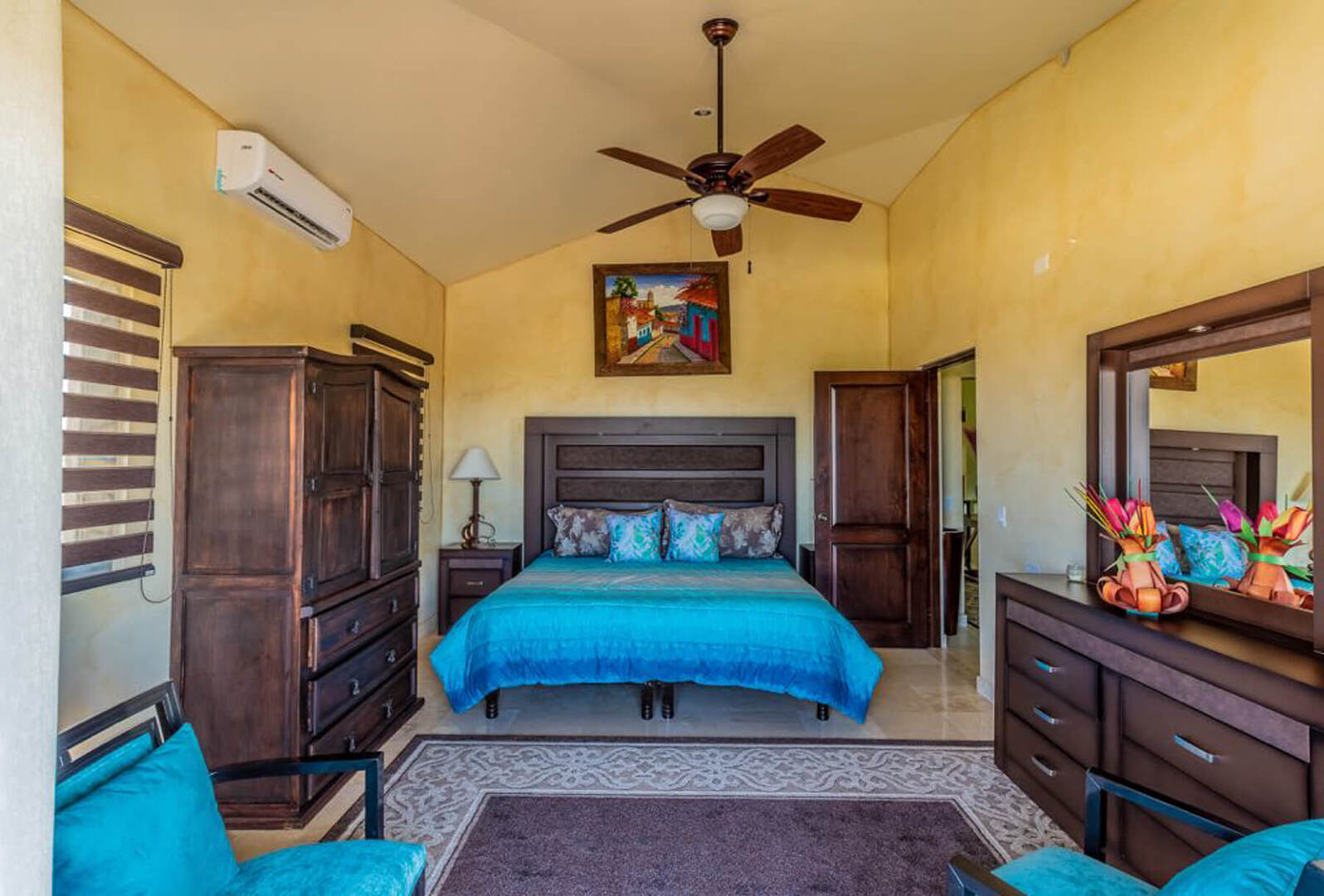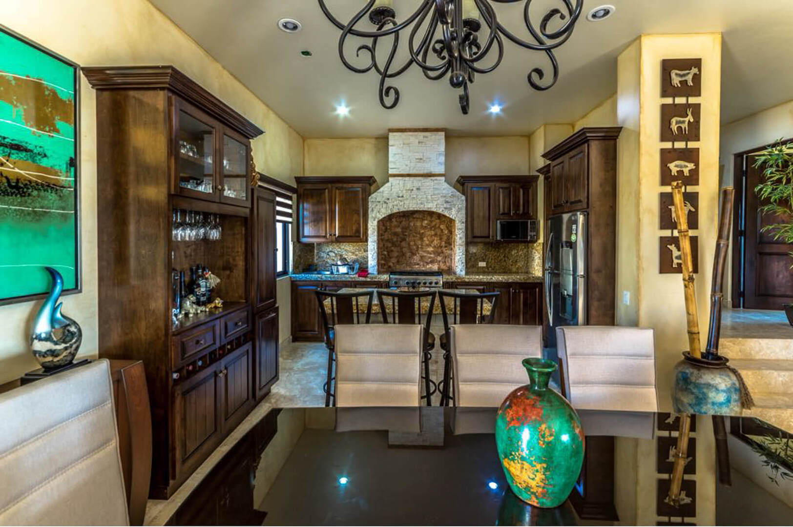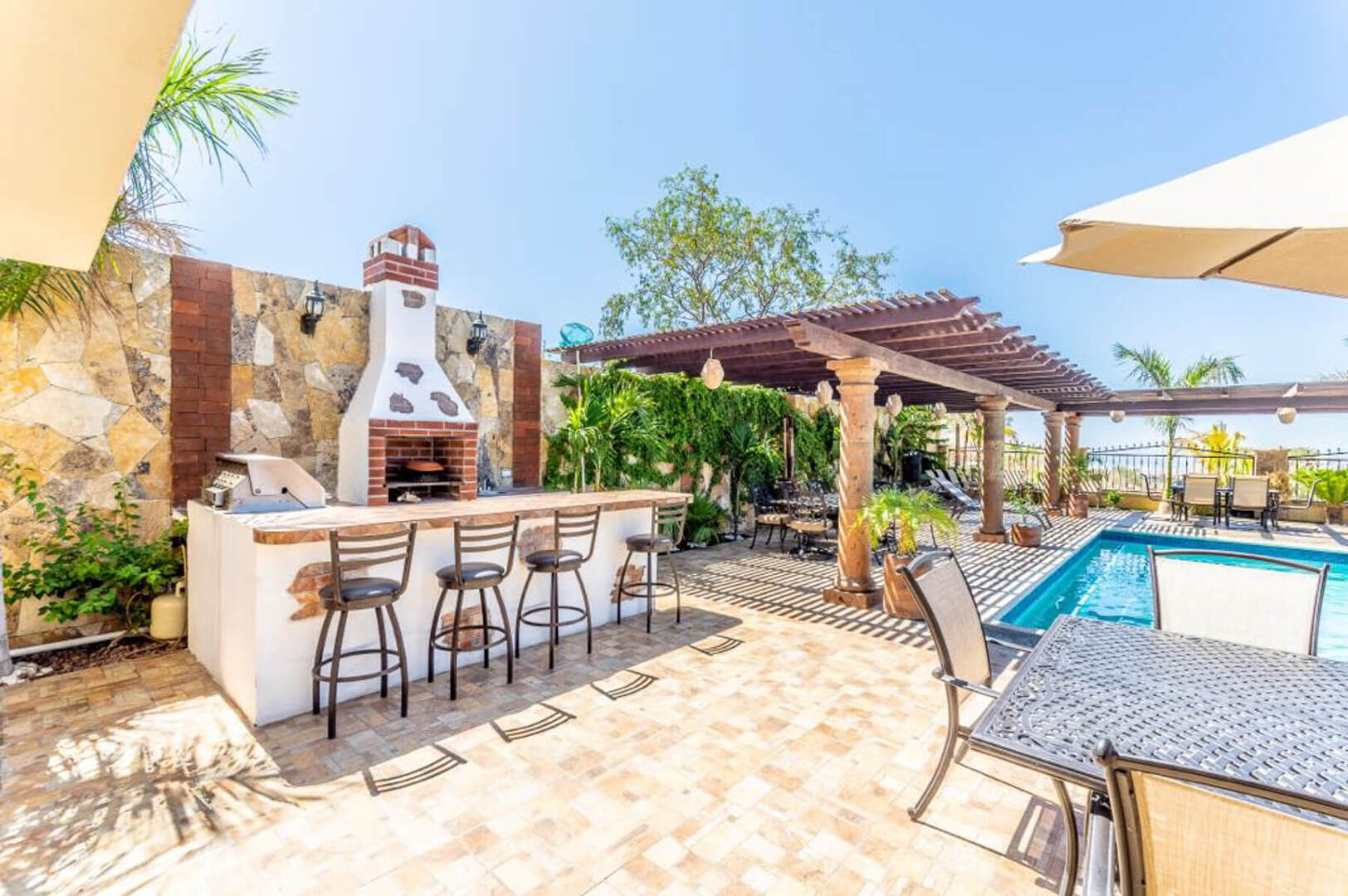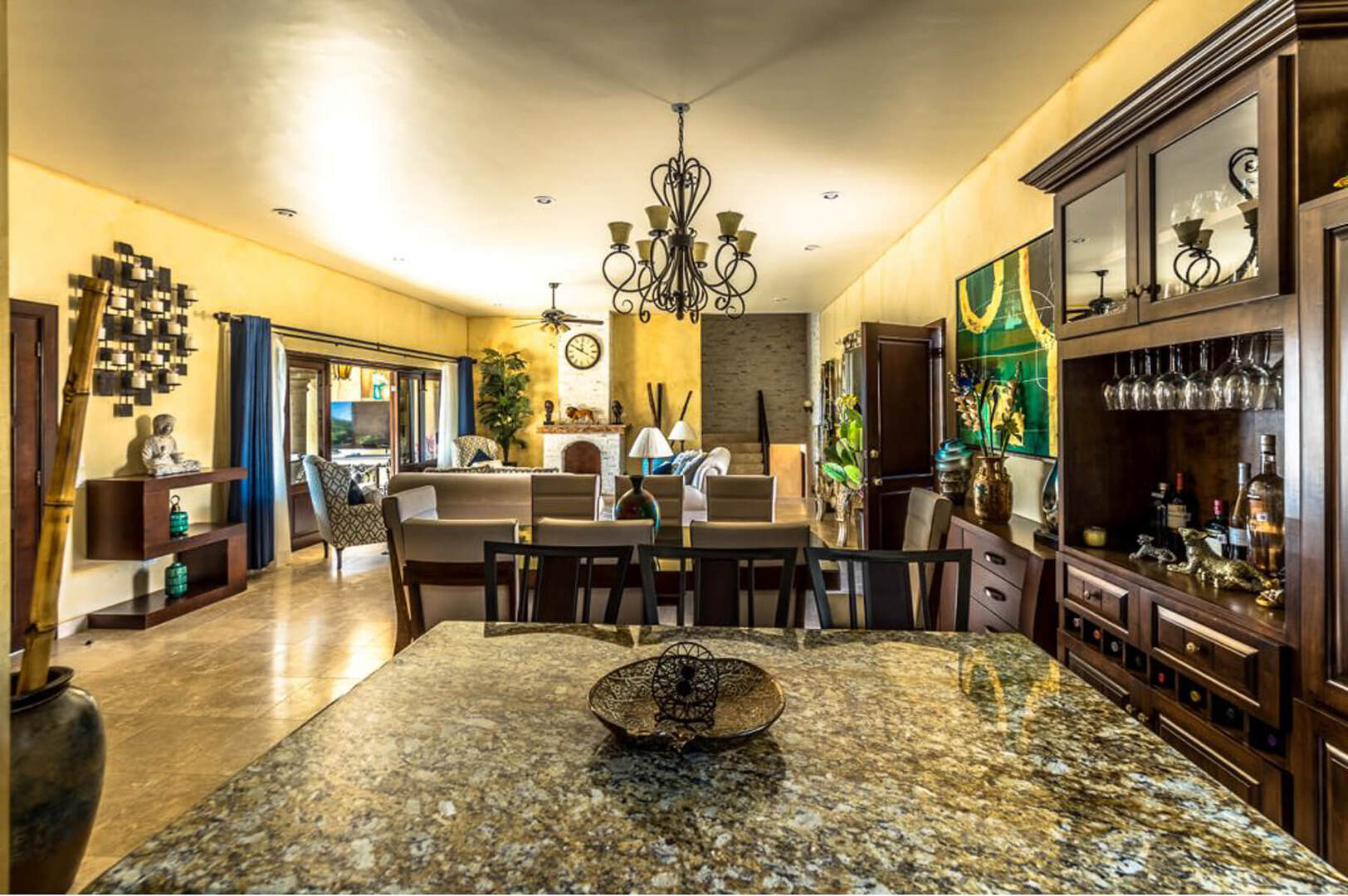 Designed with an eye for detail and unique craftmanship, Villa Finca del Tezal is accentuated by its stunning marble floors and stonework, as well as elegant furnishings and accents. Gather together around the indoor fireplace while sitting on plush cushions, or easily move from the open-concept living and dining area to the extravagant outdoor area through large sliding glass doors. You may also enjoy a gourmet meal provided by the villa staff, as you dine under the stars at the outdoor dining table.
