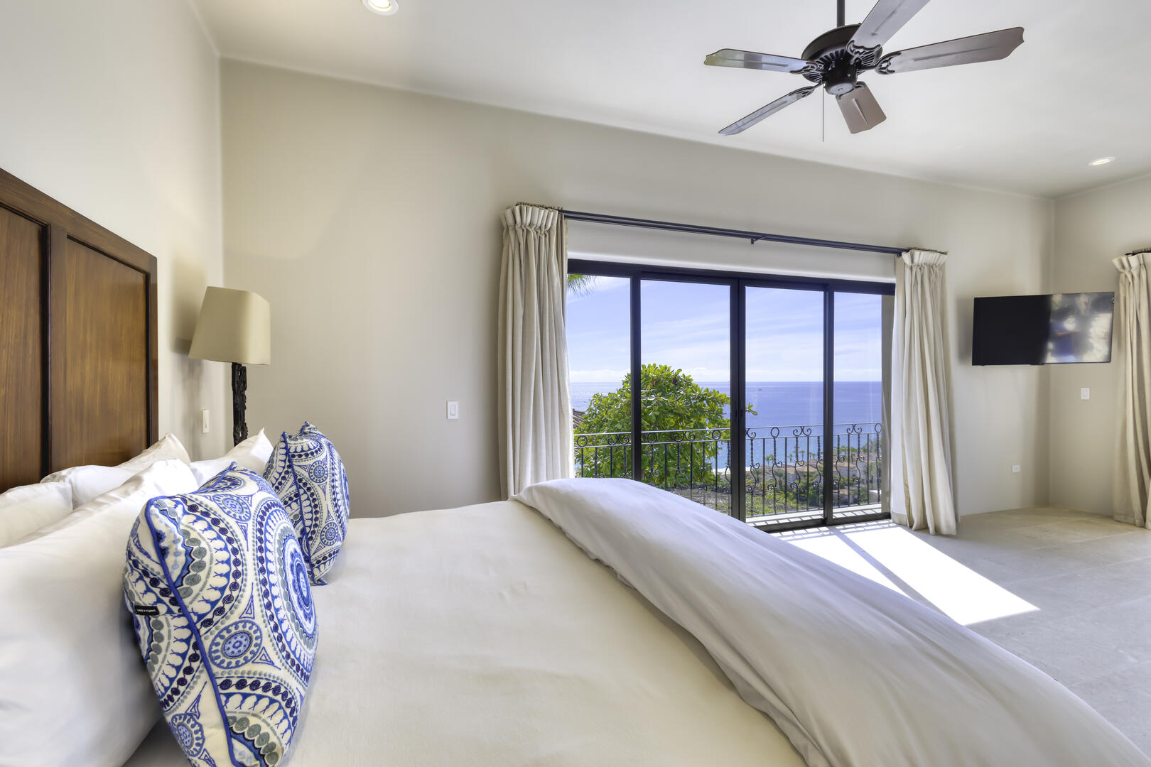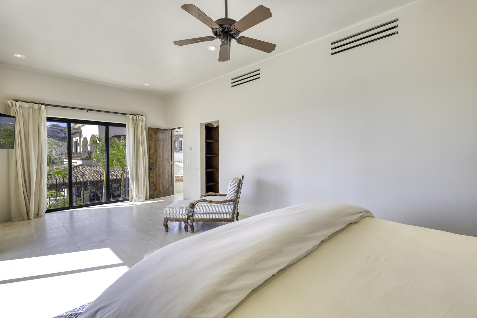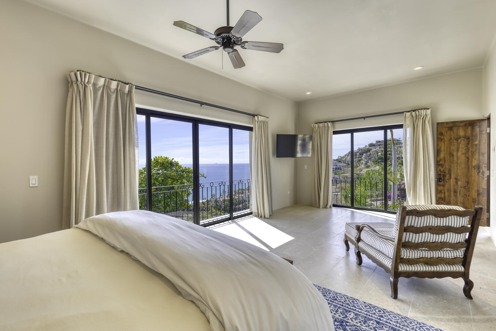 Massive glass doors open to the interior of the home and its main living space, where white and neutral hues are carried throughout, from the open living room and kitchen to the private bedrooms. The home includes the serenity of seven luxurious bedrooms, each of which comes with its own attached, full bath, and the rarity of a king bed in almost every suite, mostly oriented to take in views of the outdoor space. Watch as the sun comes up for the day or sets over the horizon from the privacy of one of the suites, or from the extensive, multi-level outdoor space. The home also includes its own exercise room, overlooking the pool terrace.