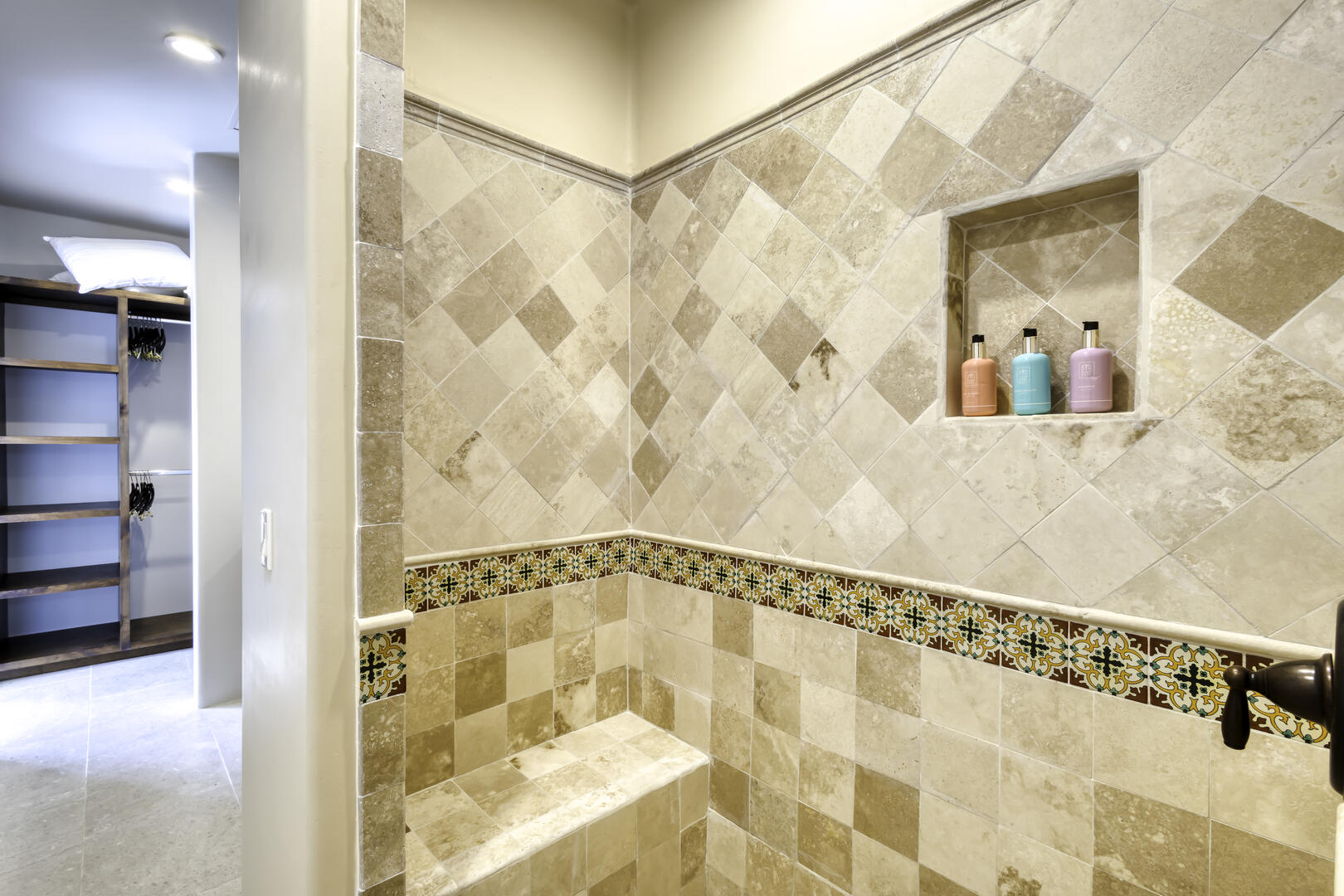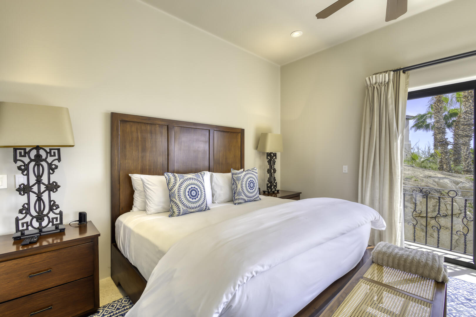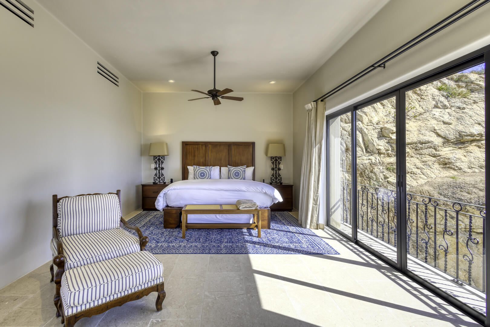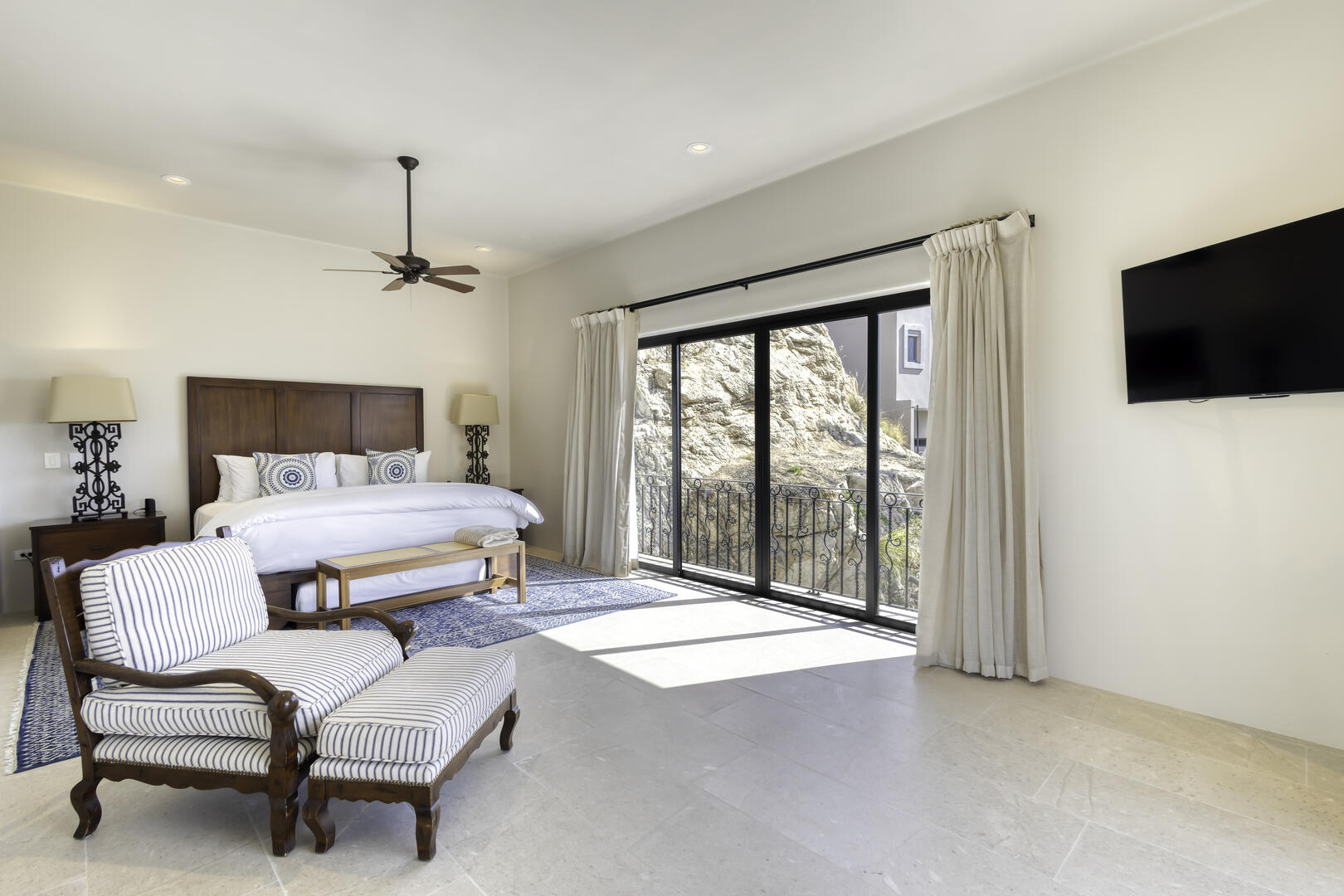 Massive glass doors open to the interior of the home and its main living space, where white and neutral hues are carried throughout, from the open living room and kitchen to the private bedrooms. The home includes the serenity of seven luxurious bedrooms, each of which comes with its own attached, full bath, and the rarity of a king bed in almost every suite, mostly oriented to take in views of the outdoor space. Watch as the sun comes up for the day or sets over the horizon from the privacy of one of the suites, or from the extensive, multi-level outdoor space. The home also includes its own exercise room, overlooking the pool terrace.
