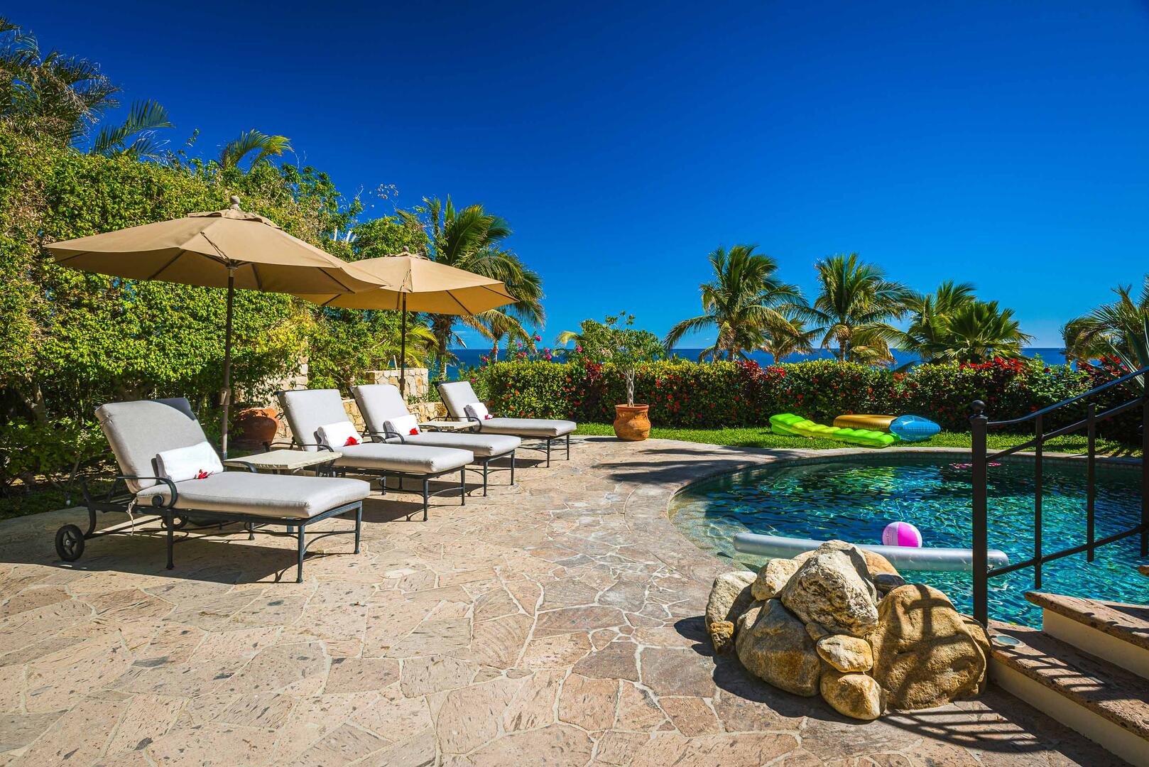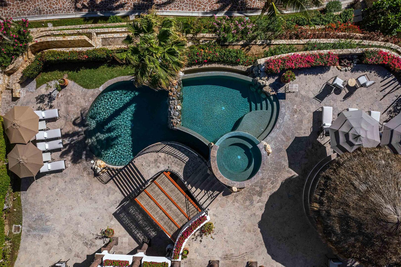 Outdoor living at Alegria is simply spectacular. There's dining for 8 al fresco with hammocks that swing in the sea breeze under a large palapa, while plush lounge beds dot the beautiful Cantera-tiled patio. At the center of this spacious terrace is a stunning tiered pool connected by a large river rock waterfall with an elevated Jacuzzi looking out over the beautiful blue waves of the Cortez. Additional features include 2 swimming pools with one on the upper and lower level, an Ultra Large 80-inch flatscreen TV with surround sound, and highspeed cable internet with WiFi.
