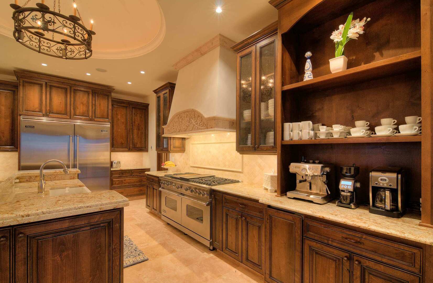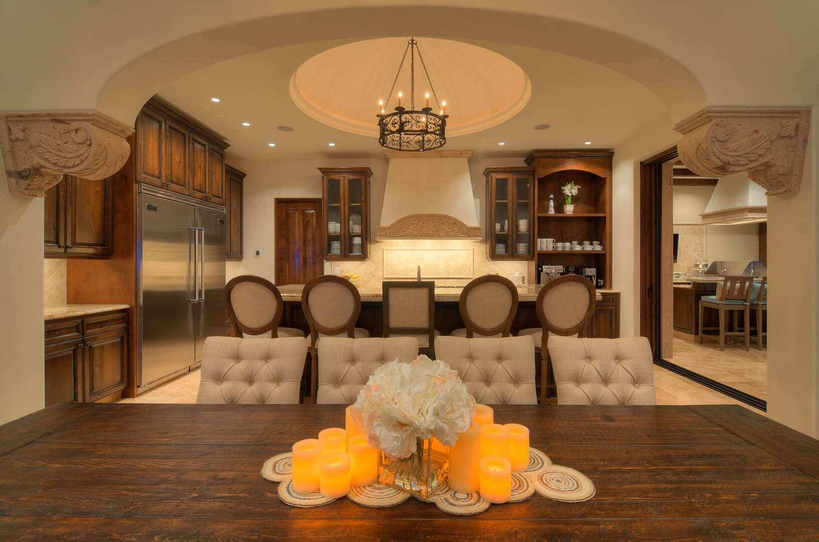 The interior of Casa Bella Villa is an intricate display of spacious luxury living accented by black iron chandeliers, smooth marble floors, and classical-style wood furnishings. The neutral hues of the floors and walls give this majestic villa a feeling of comfort without compromising on amenities, which include a media room and plenty of televisions throughout the house.
