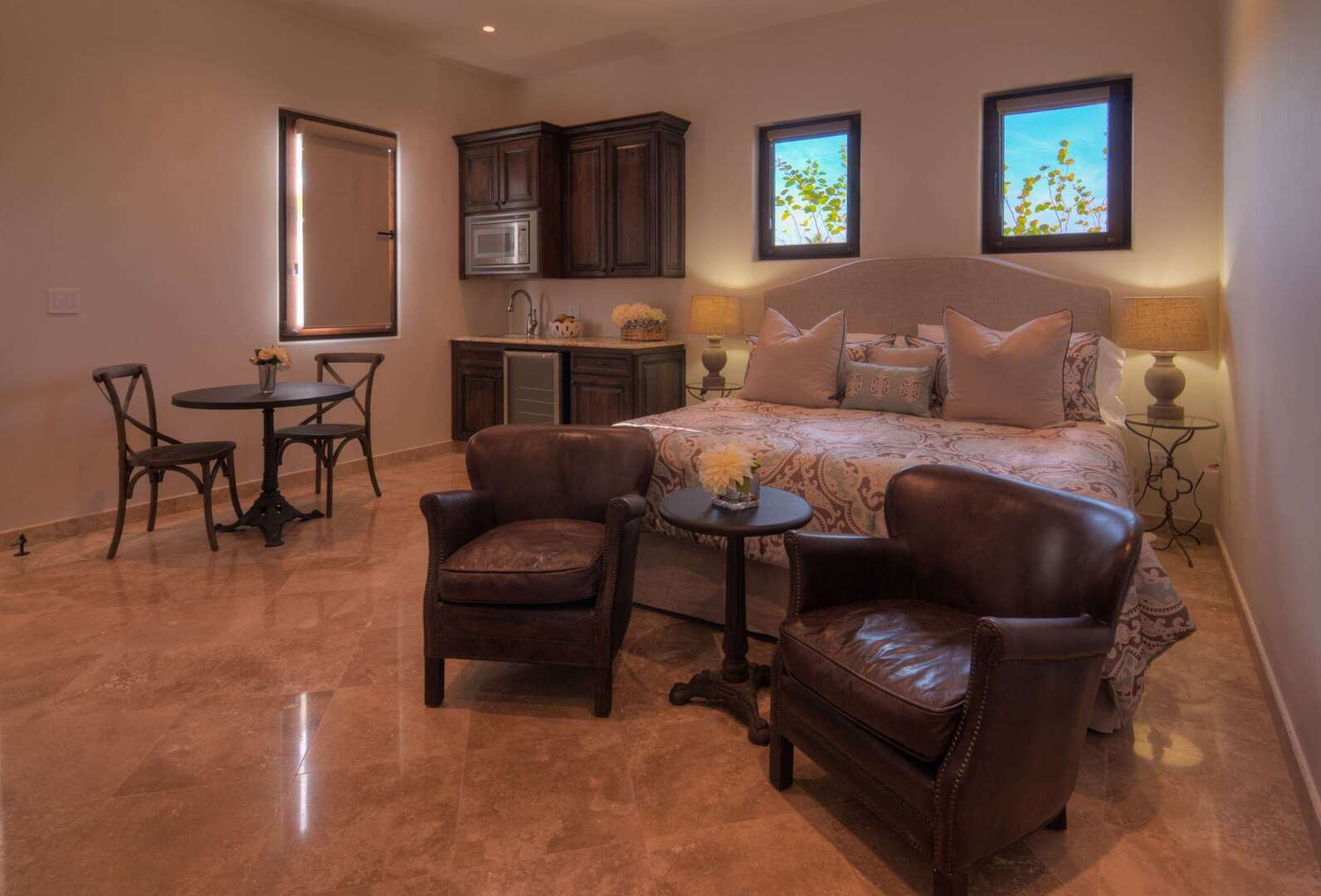 Outside, Casa Bella Villa's resort-style patio area is centered around an extravagant pool highlighted by large torch bowls and tinkling fountains. Lounge chairs and seating areas are placed strategically around the patio to help guests stay comfortable whether they are having a business meeting over coffee or simply spending a lazy afternoon reading a book and sipping on margaritas.