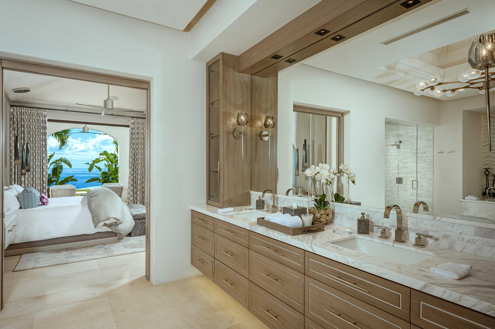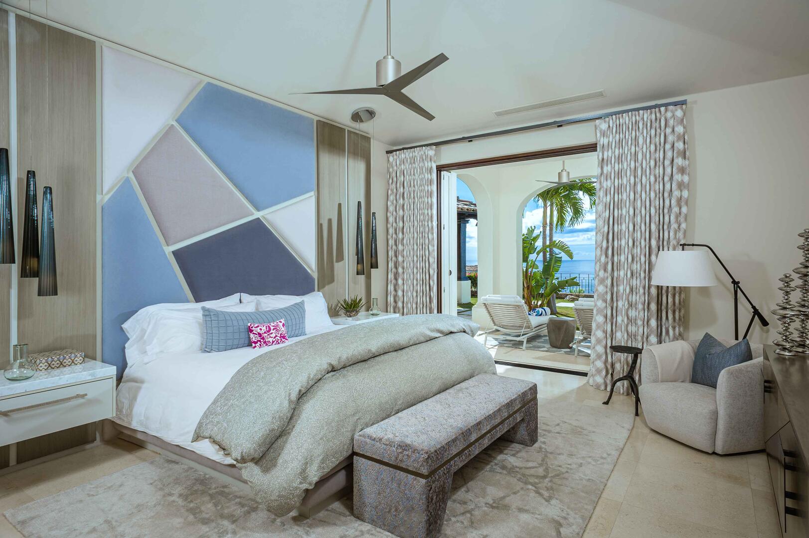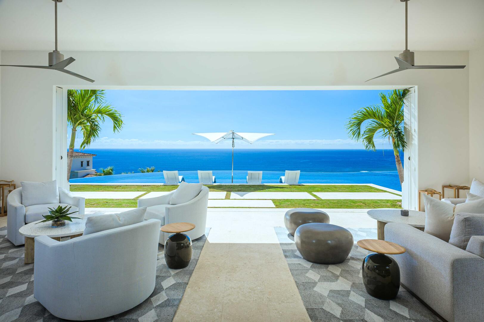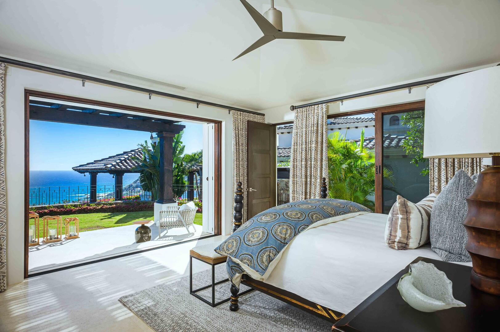 Back inside, soaring ceilings make way for contemporary fixtures and artwork, another fireplace, and hues of grey and blue that blend in perfectly with the distant ocean views. A gourmet kitchen island with extra seating accompanies a glass dining table with room for eight, while guests are also treated to the luxury of a wet bar, a wine fridge, a cozy tv room, a massive 100-inch cinema screen, and daily maid service. The refined splendor continues, as modern bedrooms open to outdoor patios and elegant baths.