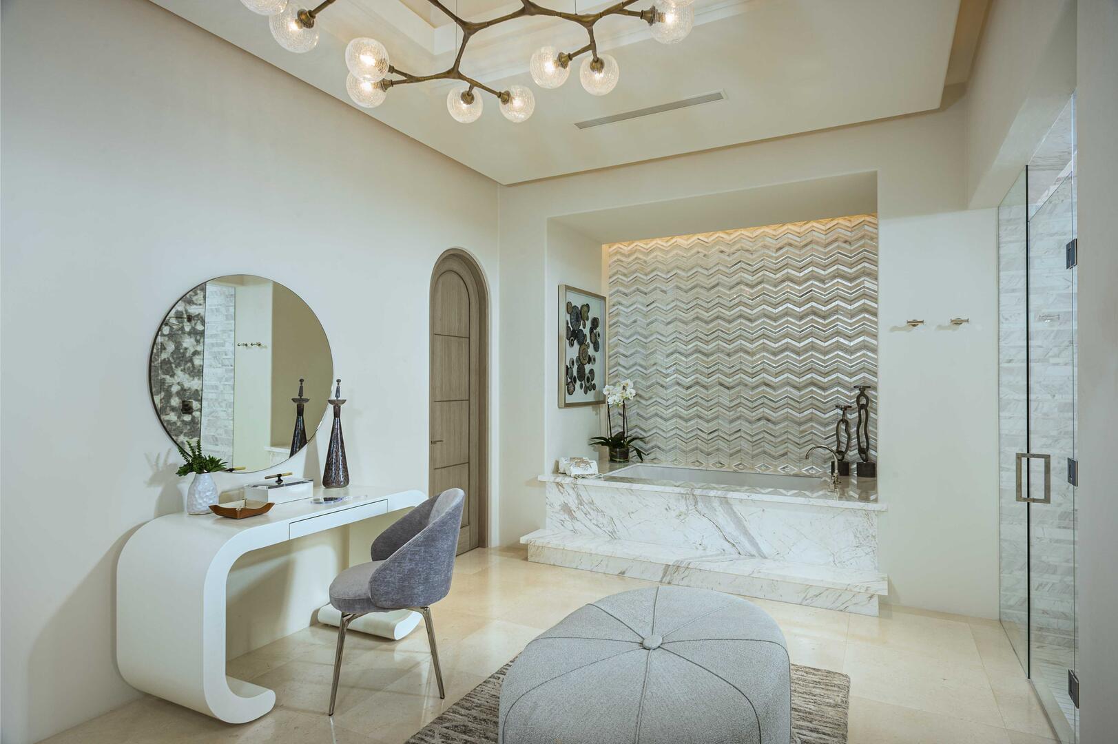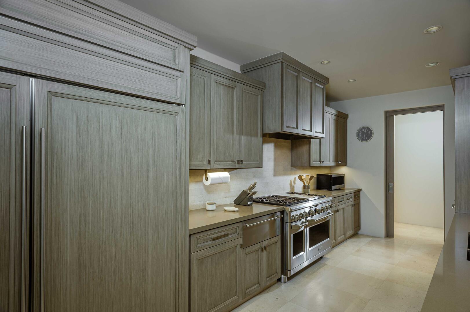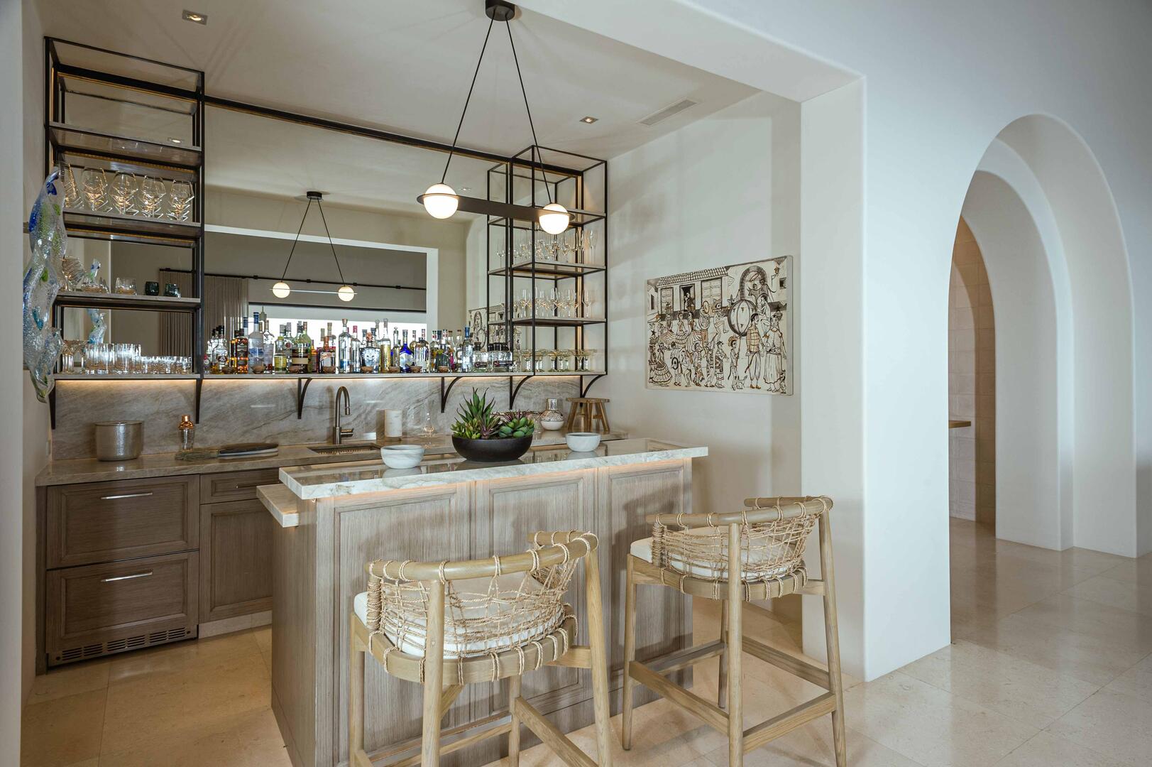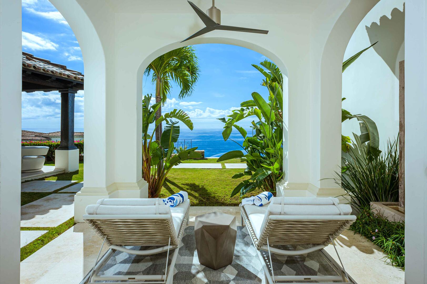 Back inside, soaring ceilings make way for contemporary fixtures and artwork, another fireplace, and hues of grey and blue that blend in perfectly with the distant ocean views. A gourmet kitchen island with extra seating accompanies a glass dining table with room for eight, while guests are also treated to the luxury of a wet bar, a wine fridge, a cozy tv room, a massive 100-inch cinema screen, and daily maid service. The refined splendor continues, as modern bedrooms open to outdoor patios and elegant baths.