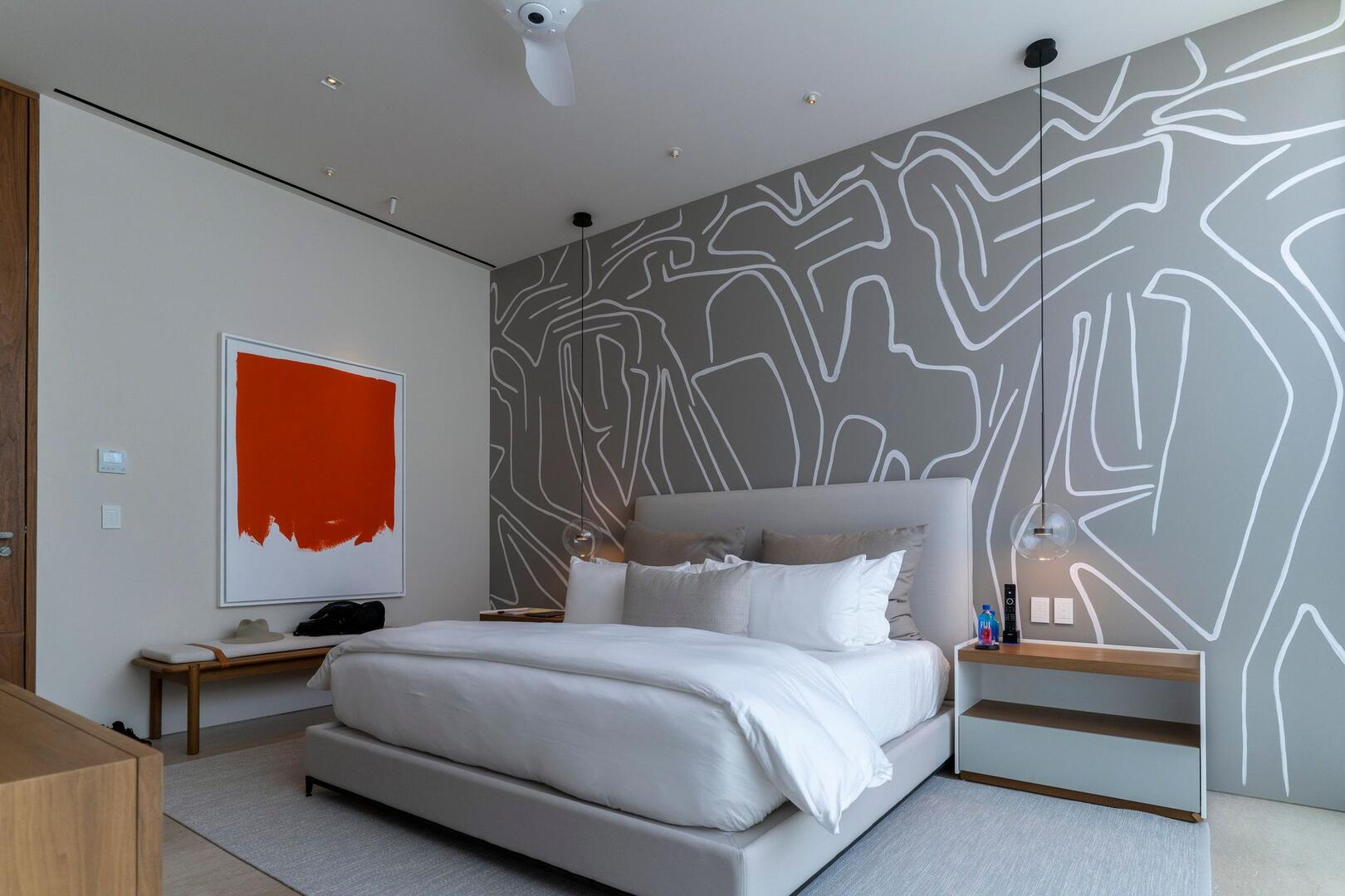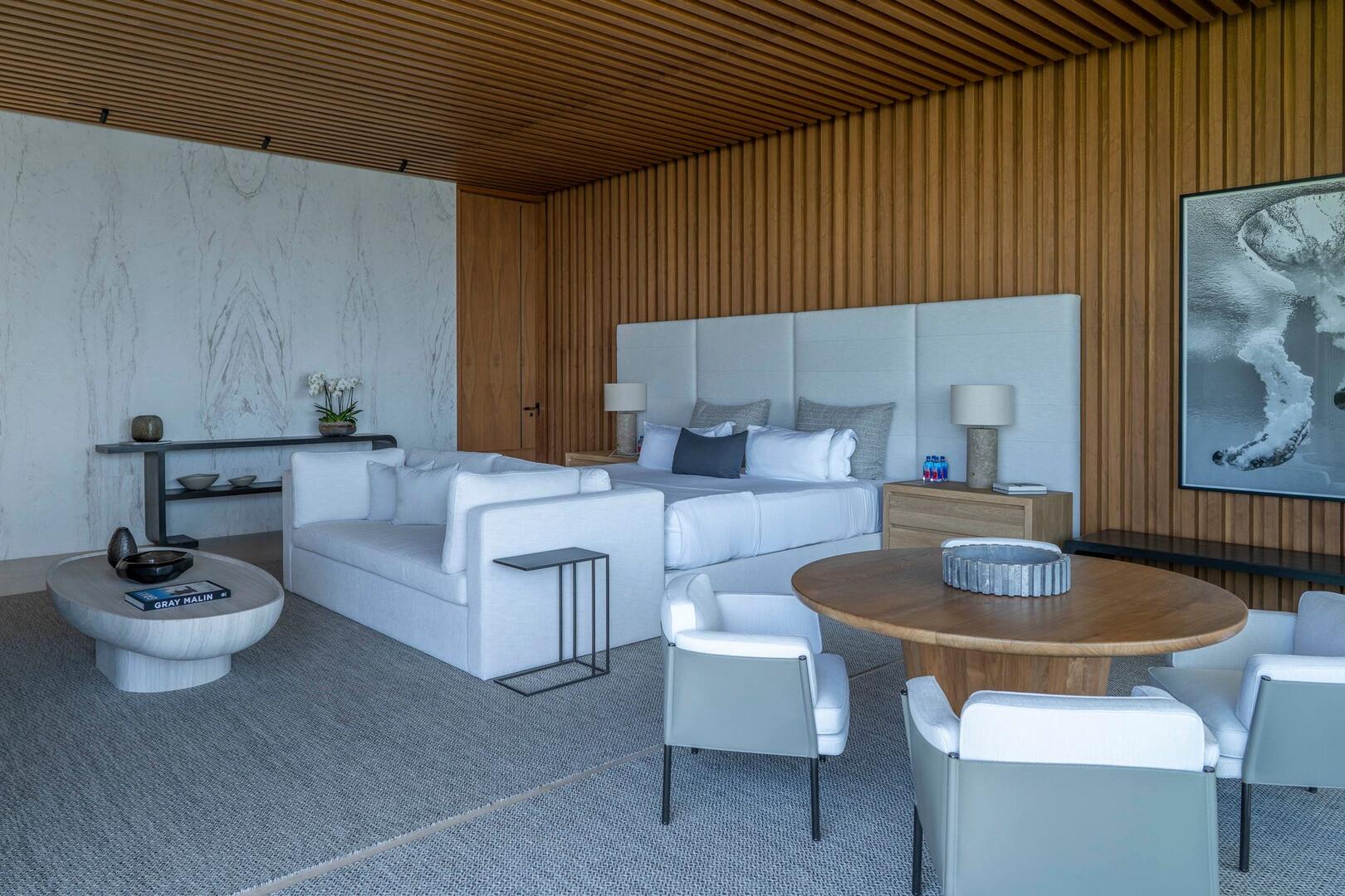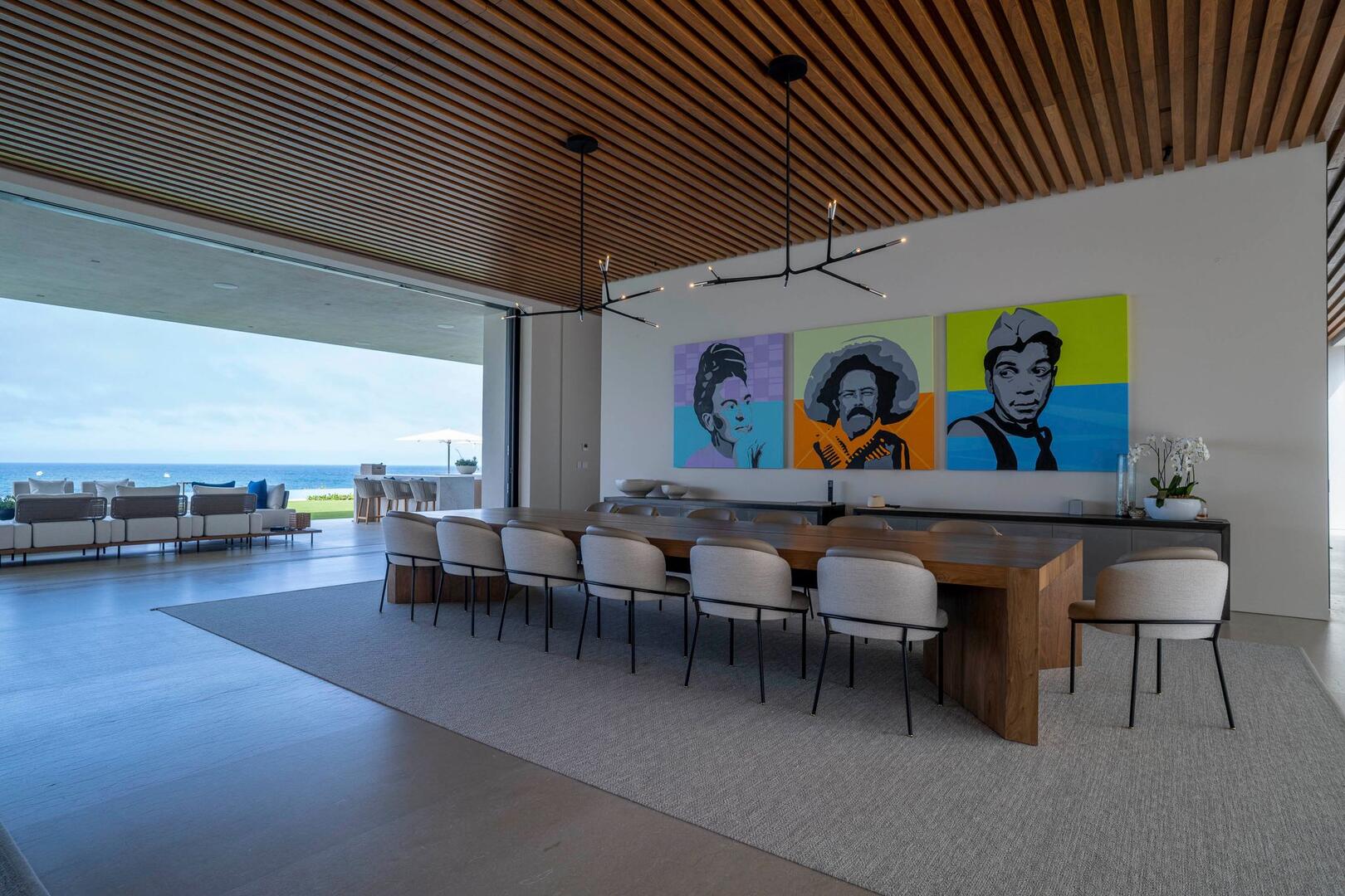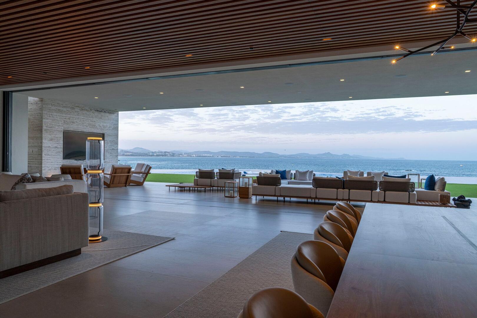 The estate's open-concept layout includes a gourmet kitchen and a grand 14-seat dining area, crafted for supreme entertaining. Throughout the villa, curated artwork echoes the natural beauty of the sea and sky, while massive glass doors open to welcome the gentle breezes and warm sunshine of Los Cabos.