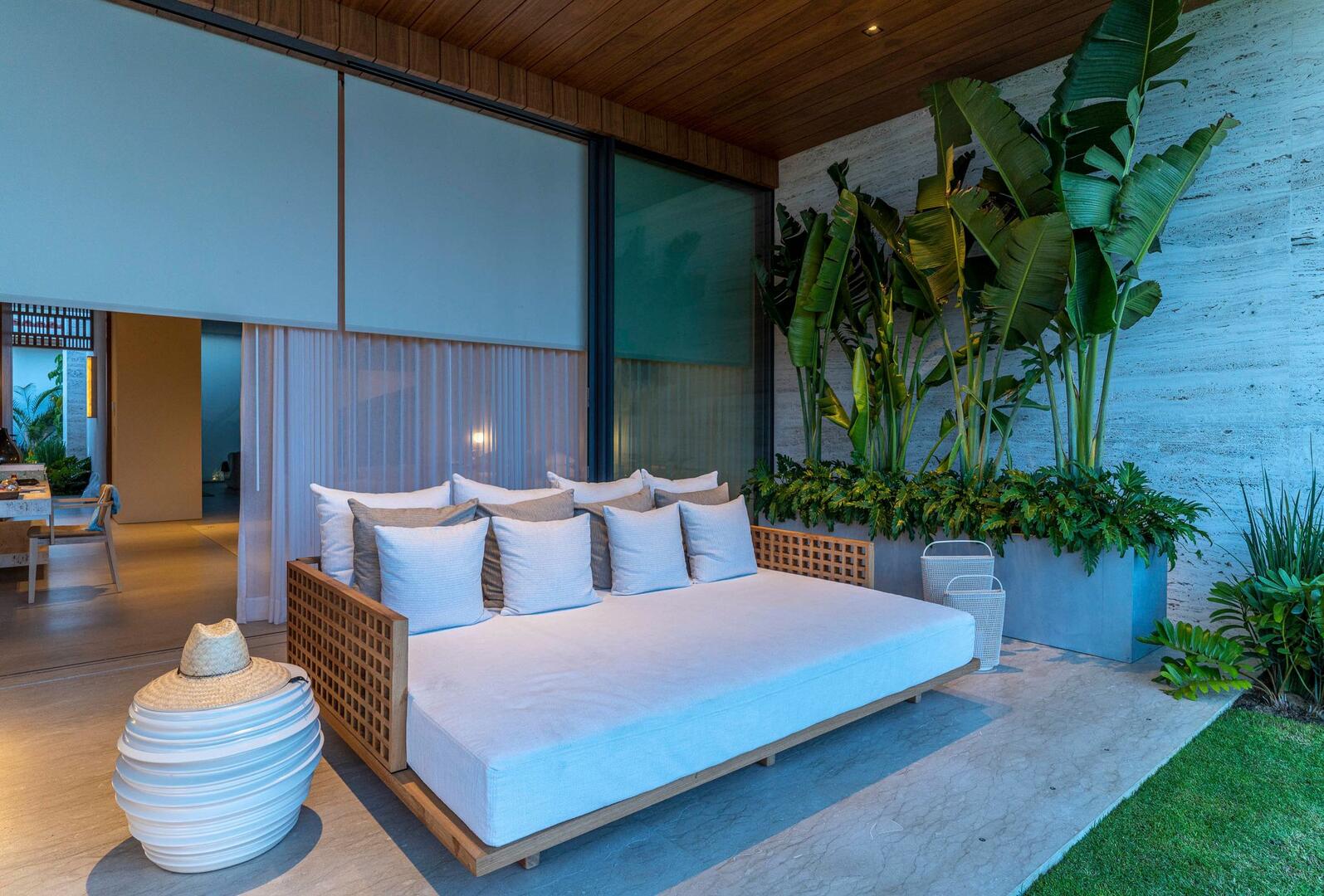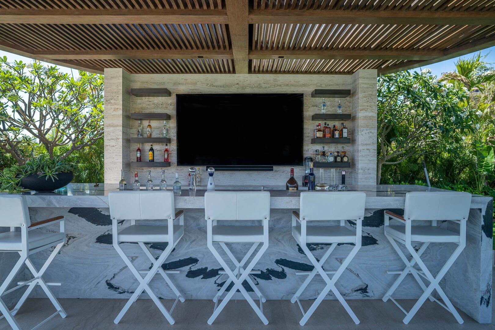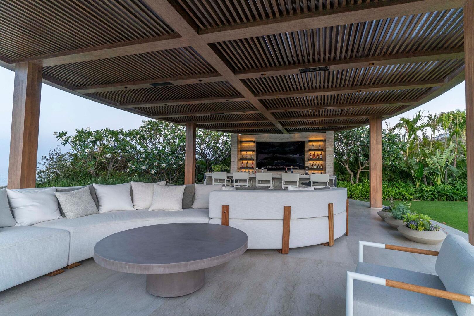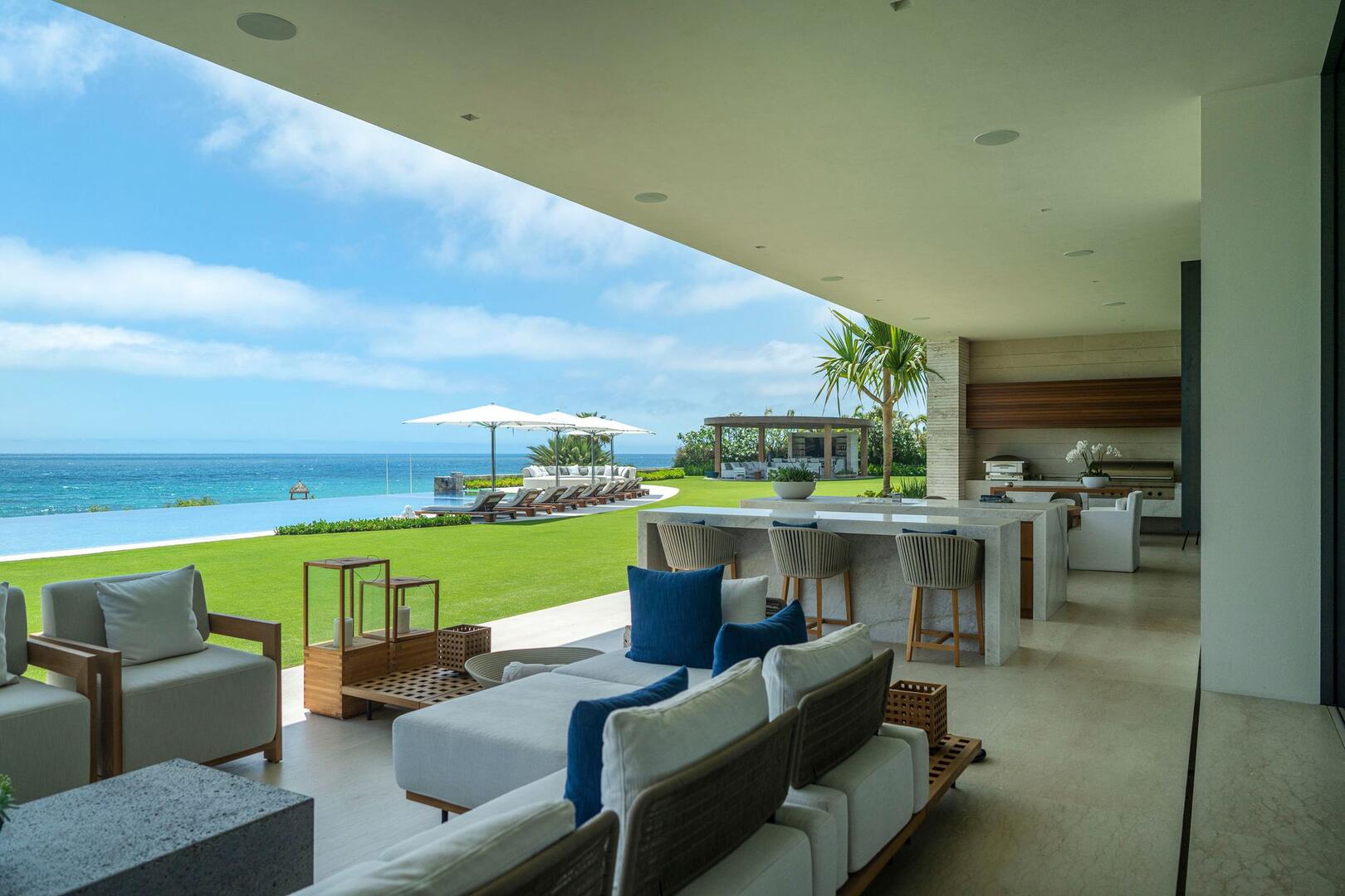 Casa Elije's expansive multi-level terraces boast a deluxe gas grill, fire pit, rattan lounge beds, and teak sun chairs arrayed around the infinity-edge pool, creating an idyllic setting for relaxation or lively social gatherings.