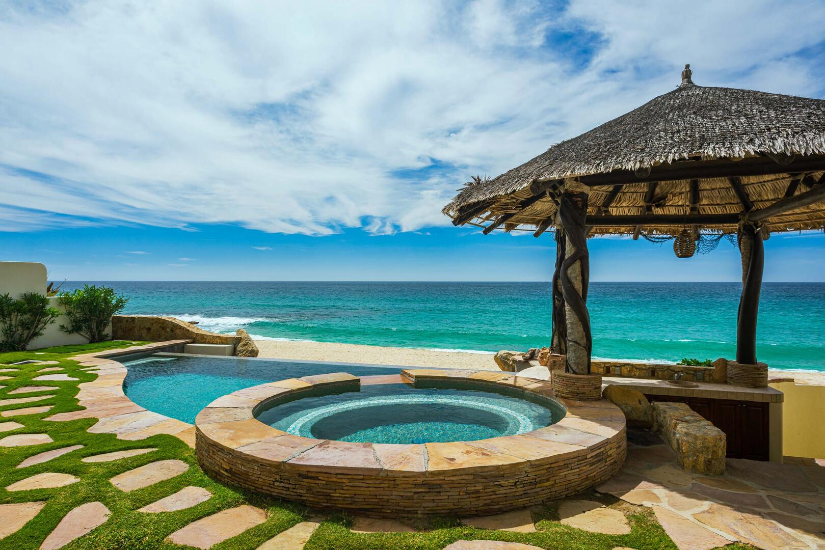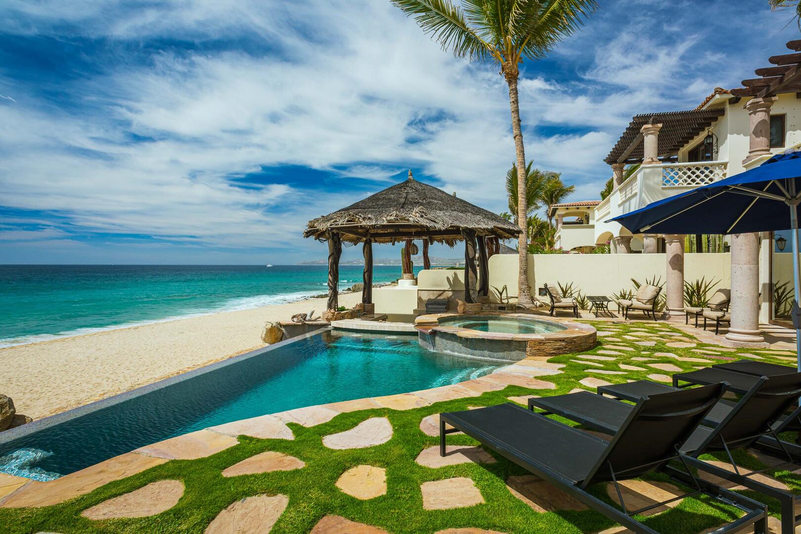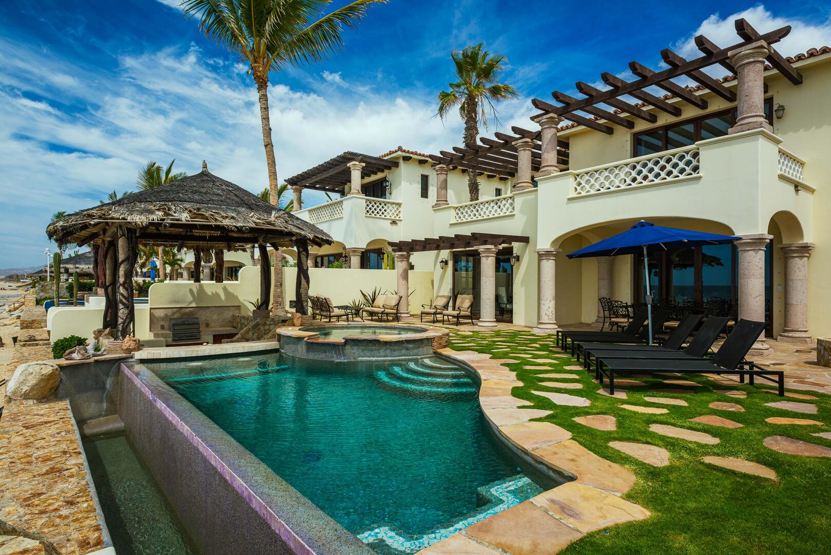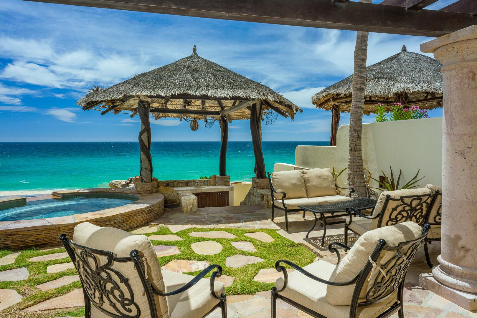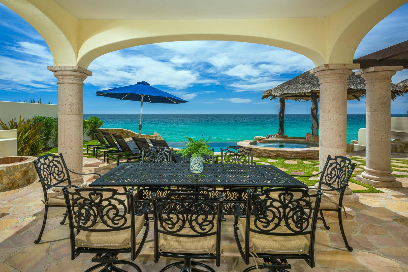 Bordering the crystal blue Sea of Cortez, Mayas outdoor terrace is the gem of this magnificent home. Expertly manicured green grass surrounds each Cantera tile on the pool terrace, providing a cool path to the infinity pool. Adjacent to the pool is a large Palapa, offering a shaded spot to enjoy an afternoon cocktail at the swim-up bar or grill up the catch of the day on the deluxe gas BBQ. Guests can also observe the majestic sight of Grey Whales swimming offshore while soaking in Mayas elevated Jacuzzi. With its gorgeous setting right on the warm white sands and azure surf of. El Encanto de la Laguna, Casa Maya is the ideal escape for those seeking a secluded, luxurious beachfront home amidst the natural beauty of Los Cabos East Cape.