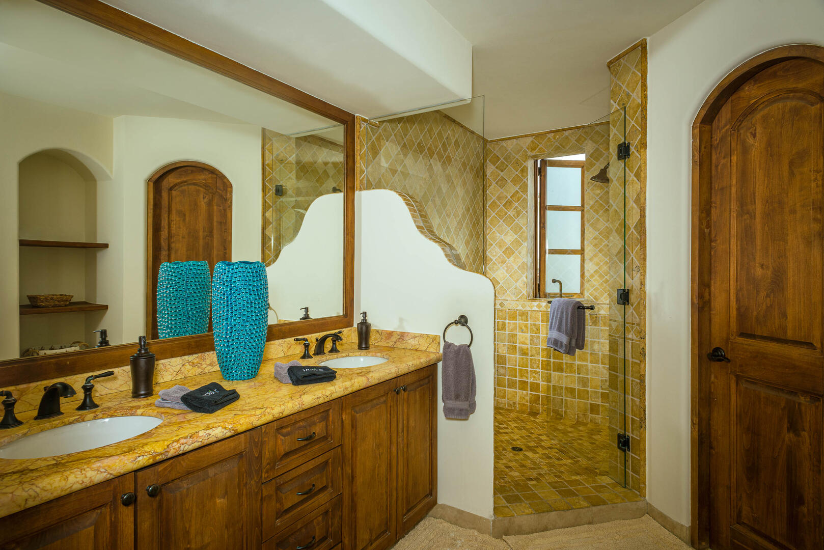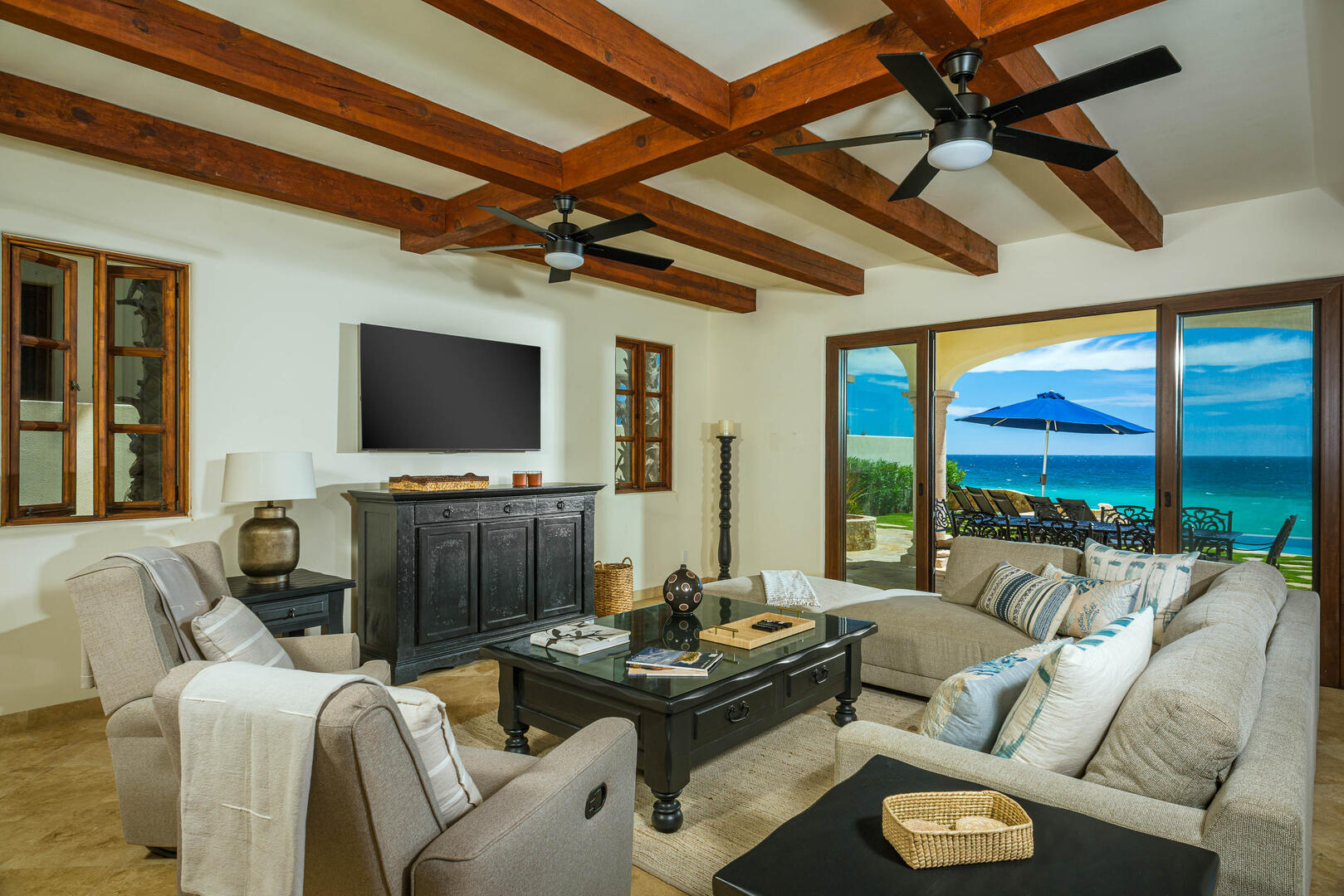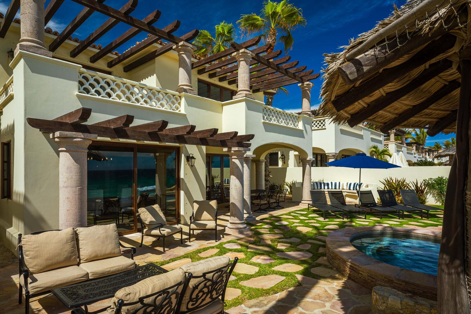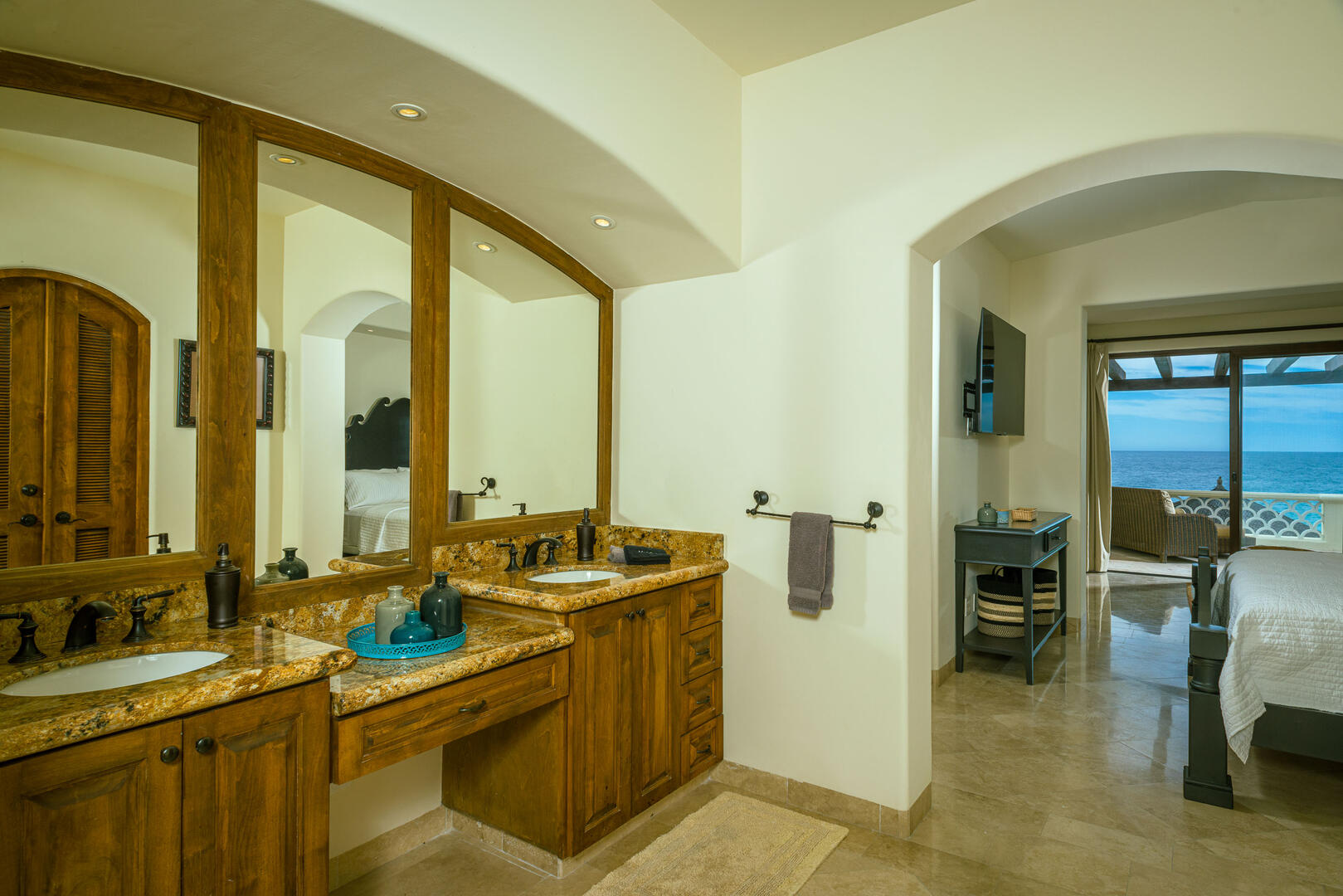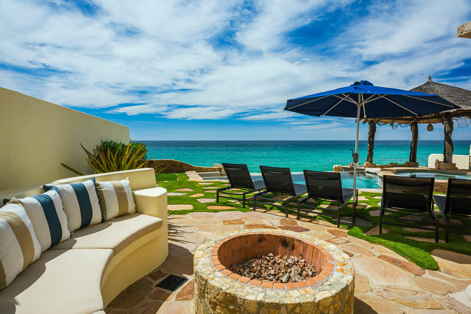 Bordering the crystal blue Sea of Cortez, Mayas outdoor terrace is the gem of this magnificent home. Expertly manicured green grass surrounds each Cantera tile on the pool terrace, providing a cool path to the infinity pool. Adjacent to the pool is a large Palapa, offering a shaded spot to enjoy an afternoon cocktail at the swim-up bar or grill up the catch of the day on the deluxe gas BBQ. Guests can also observe the majestic sight of Grey Whales swimming offshore while soaking in Mayas elevated Jacuzzi. With its gorgeous setting right on the warm white sands and azure surf of. El Encanto de la Laguna, Casa Maya is the ideal escape for those seeking a secluded, luxurious beachfront home amidst the natural beauty of Los Cabos East Cape.