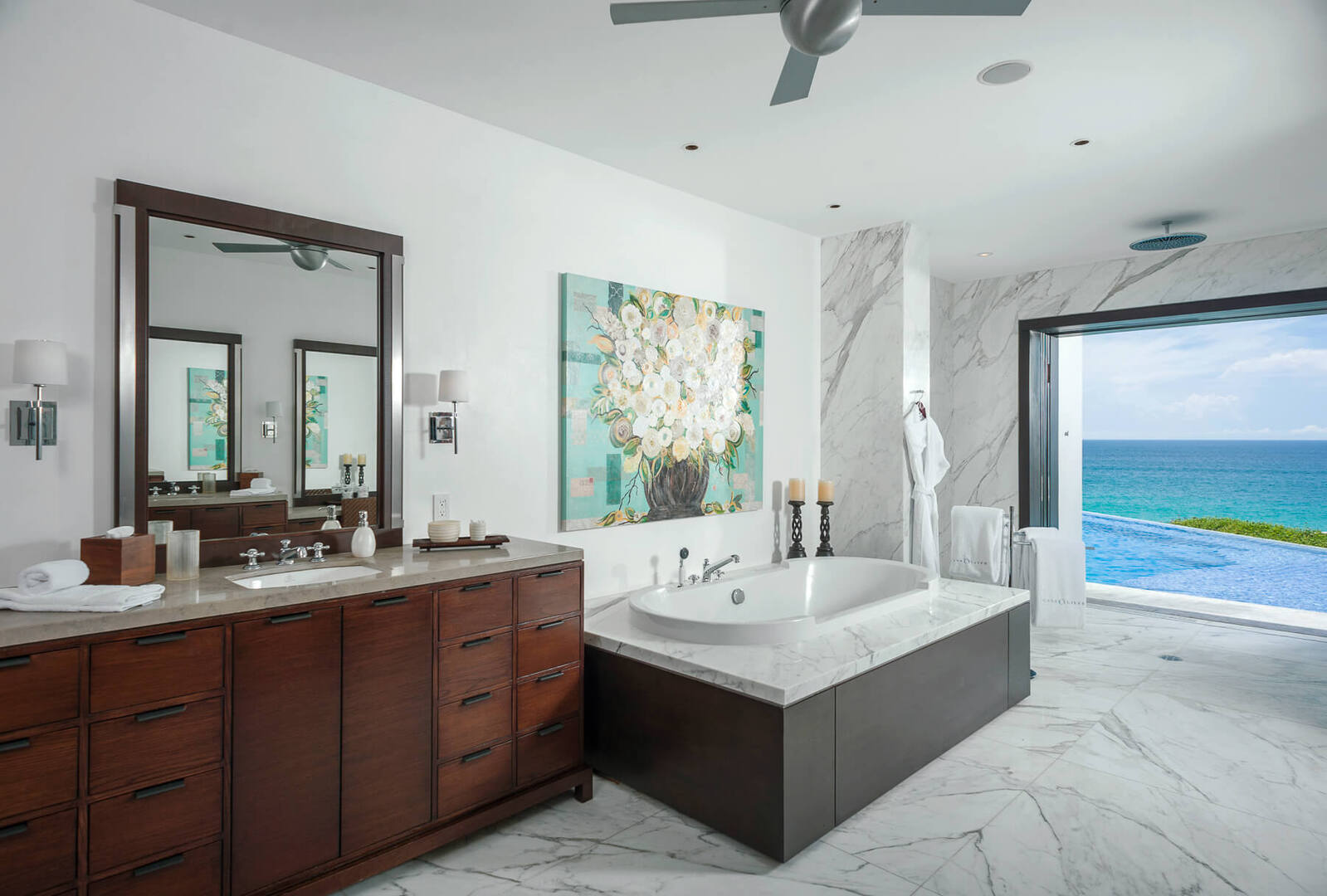 Discover perfection on Casa Oliver's multi-level terraces where 5-star resort luxury meets endless ocean vistas. Outdoor living at Oliver includes a deluxe gas grill and fire pit, rattan lounge beds, and teak sun chairs that seemingly float in the shallow waters of the glistening infinity-edge pool.