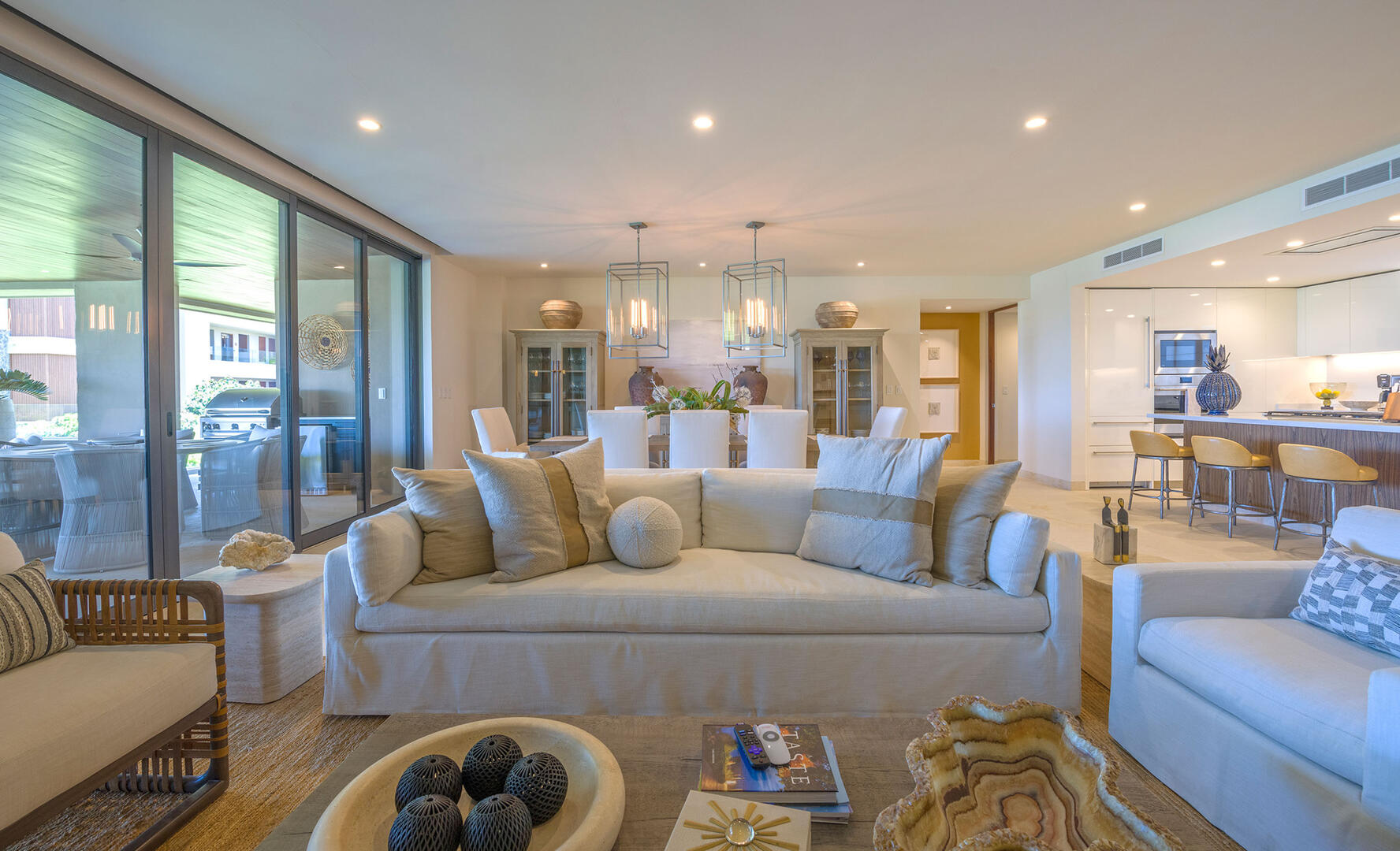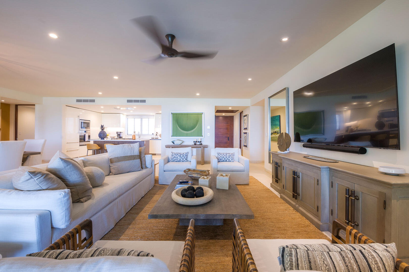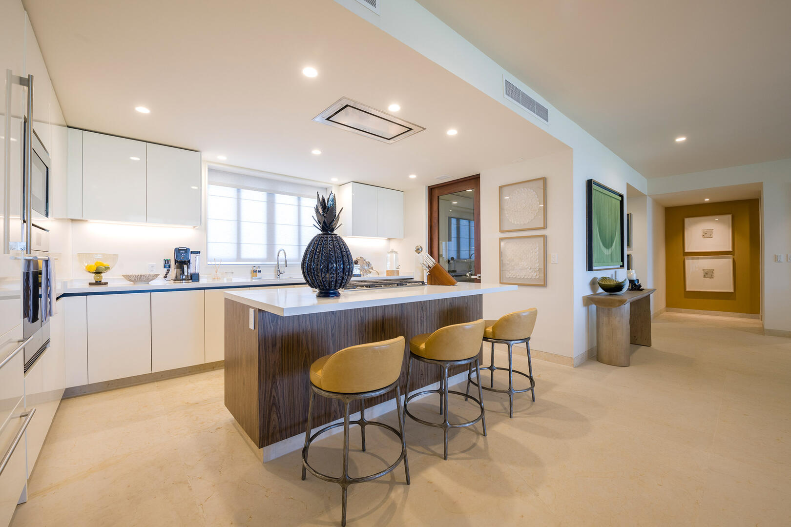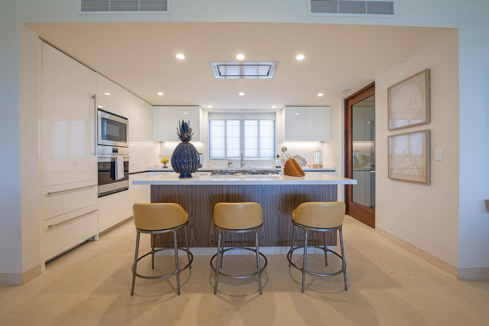 Enjoy additional views, as the private bedrooms also open to outdoor seating space. In the main section of the condo, sophisticated lighting extends from the ceiling above a formal dining table for eight, alongside a living room with comfortable seating and a flatscreen TV. This extremely open section of the condo also includes some island seating in the gourmet kitchen with stark white cabinetry and countertops. Sit back and relax in the space, as the condo features a chef for breakfast preparation, as well as daily housekeeping and concierge services. For added convenience, the condo comes with free Wifi and a water purification system.