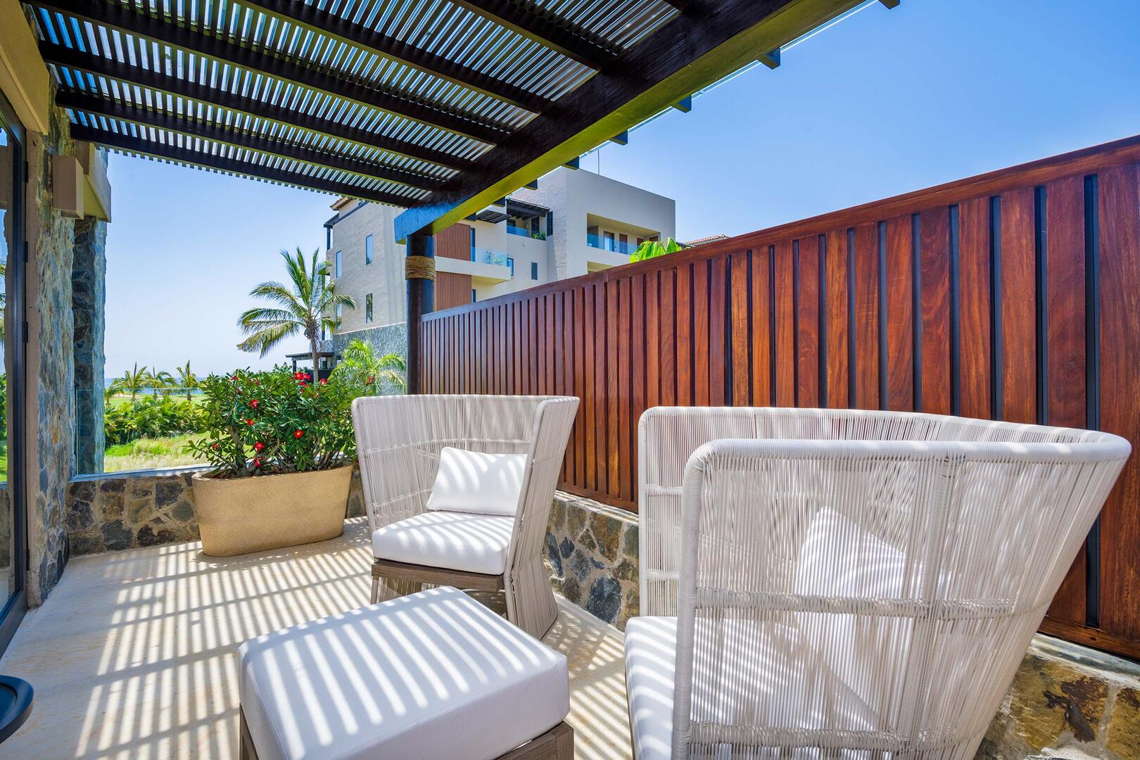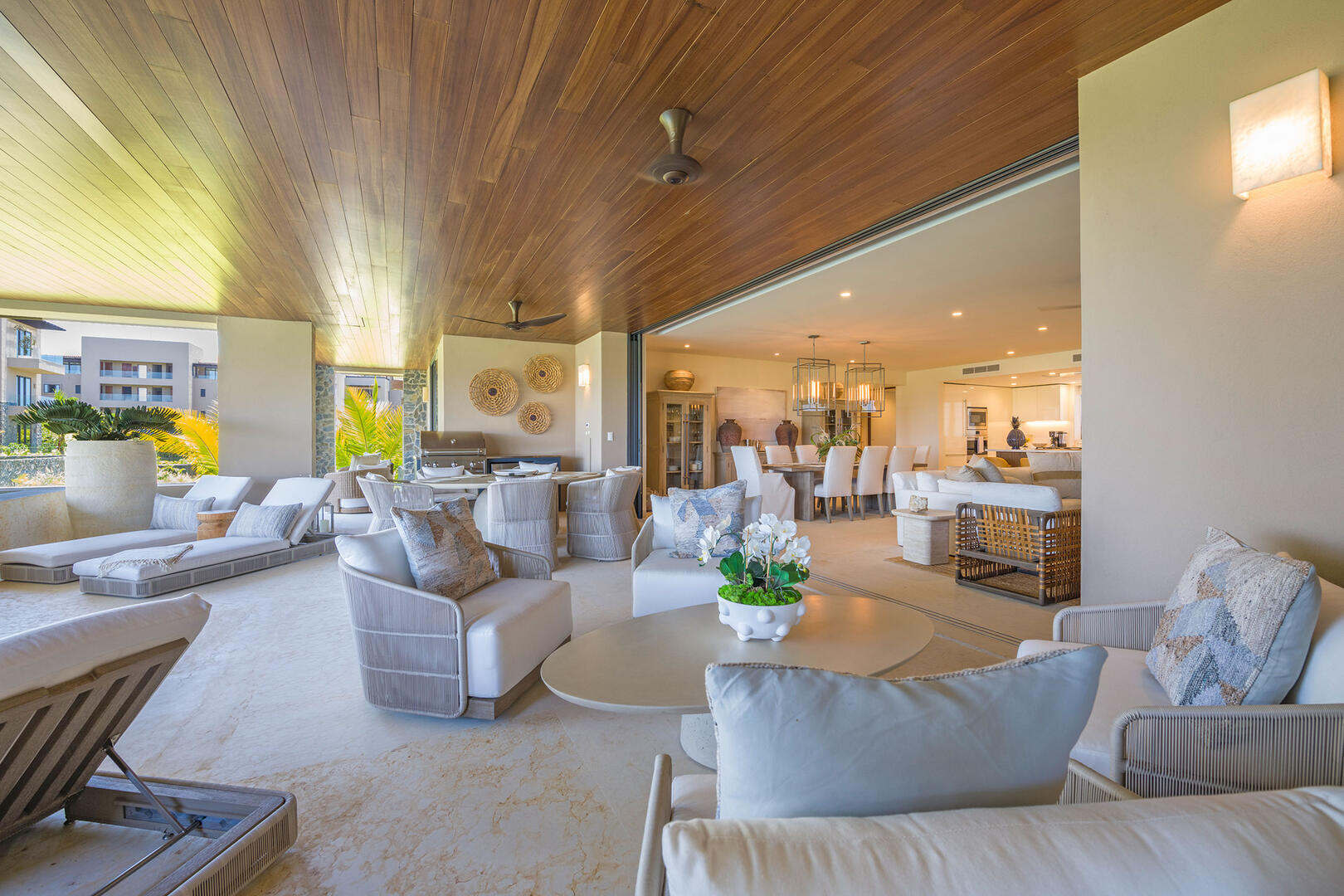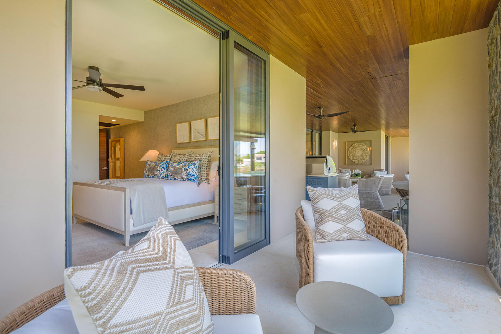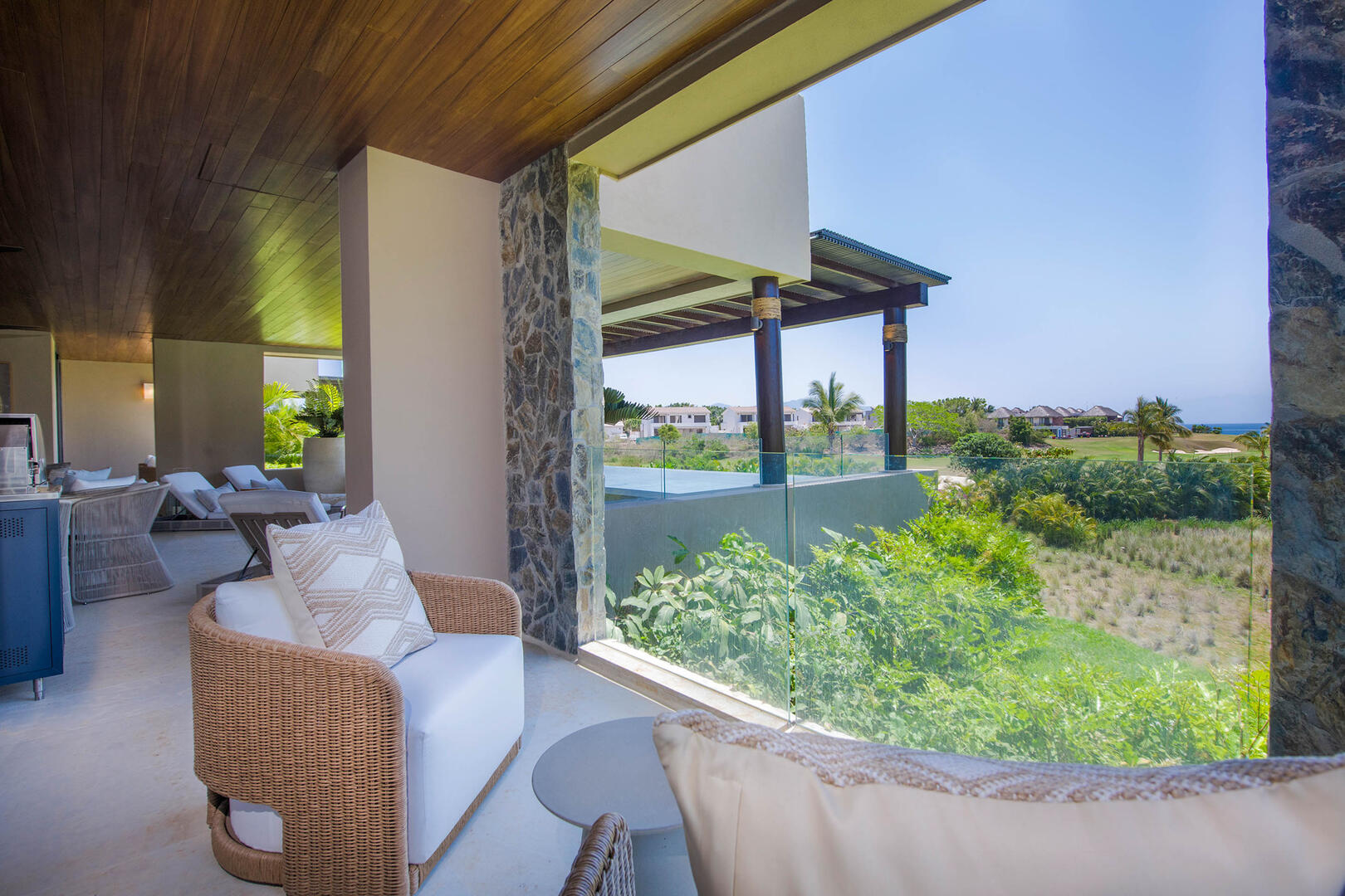 The covered terrace feels like a true extension of the condo's indoor space, accented by white furnishings, elegant décor and artwork. The four deck loungers sit right alongside the private plunge pool, positioned to take in some of the best views across the landscaped golf course and ocean beyond. Swim right up to the edge of your own private space, while the sheltered outdoor area extends to include enough room to house an outdoor dining table, a gas grill, and an outdoor kitchen, making it just as easy to dine al fresco as it is to dine indoors, all while soaking up the natural views and terrain of Punta Mita.