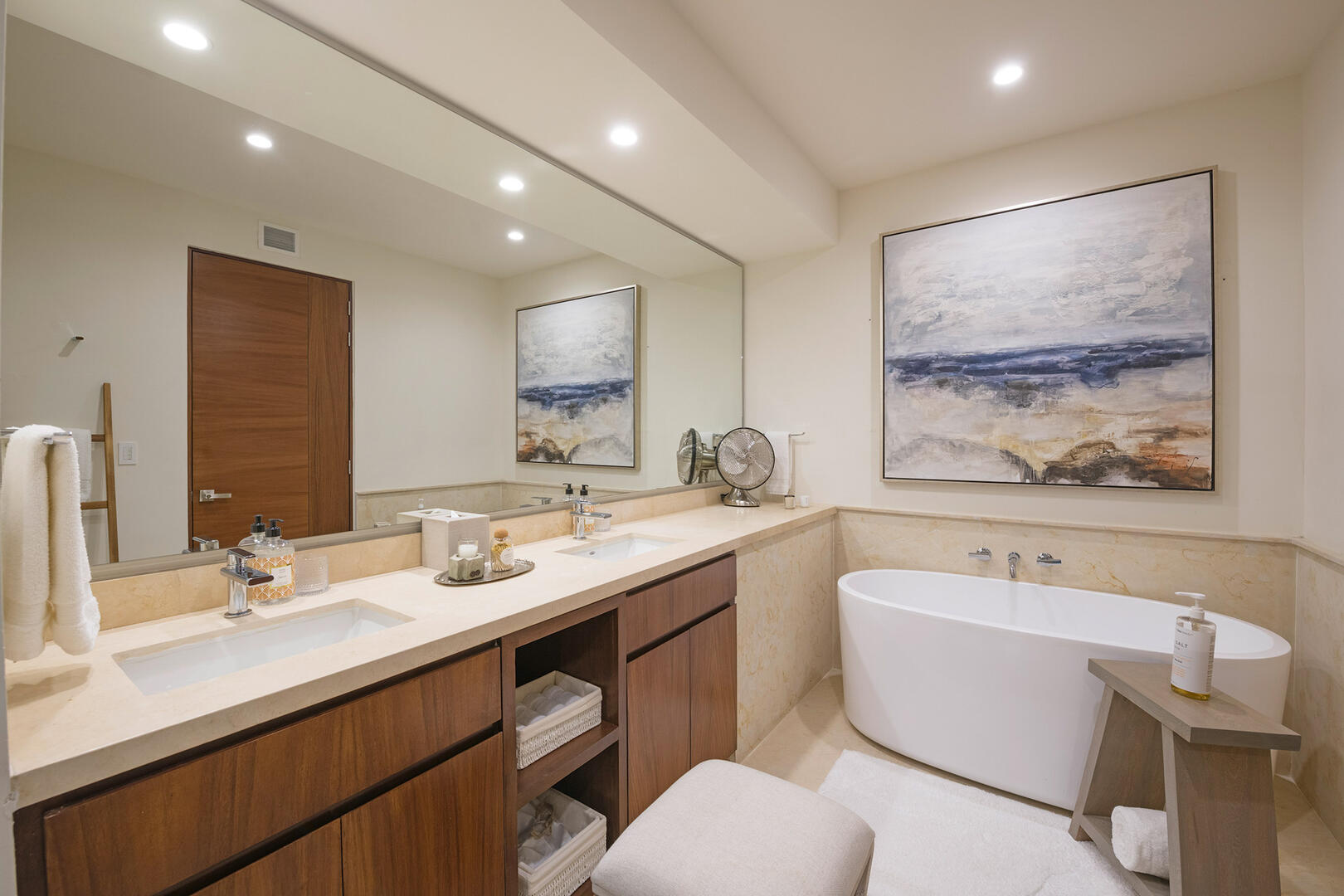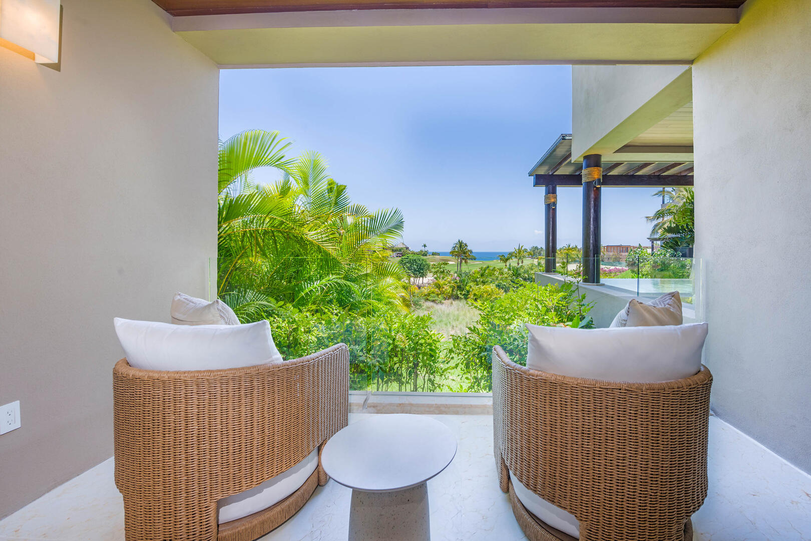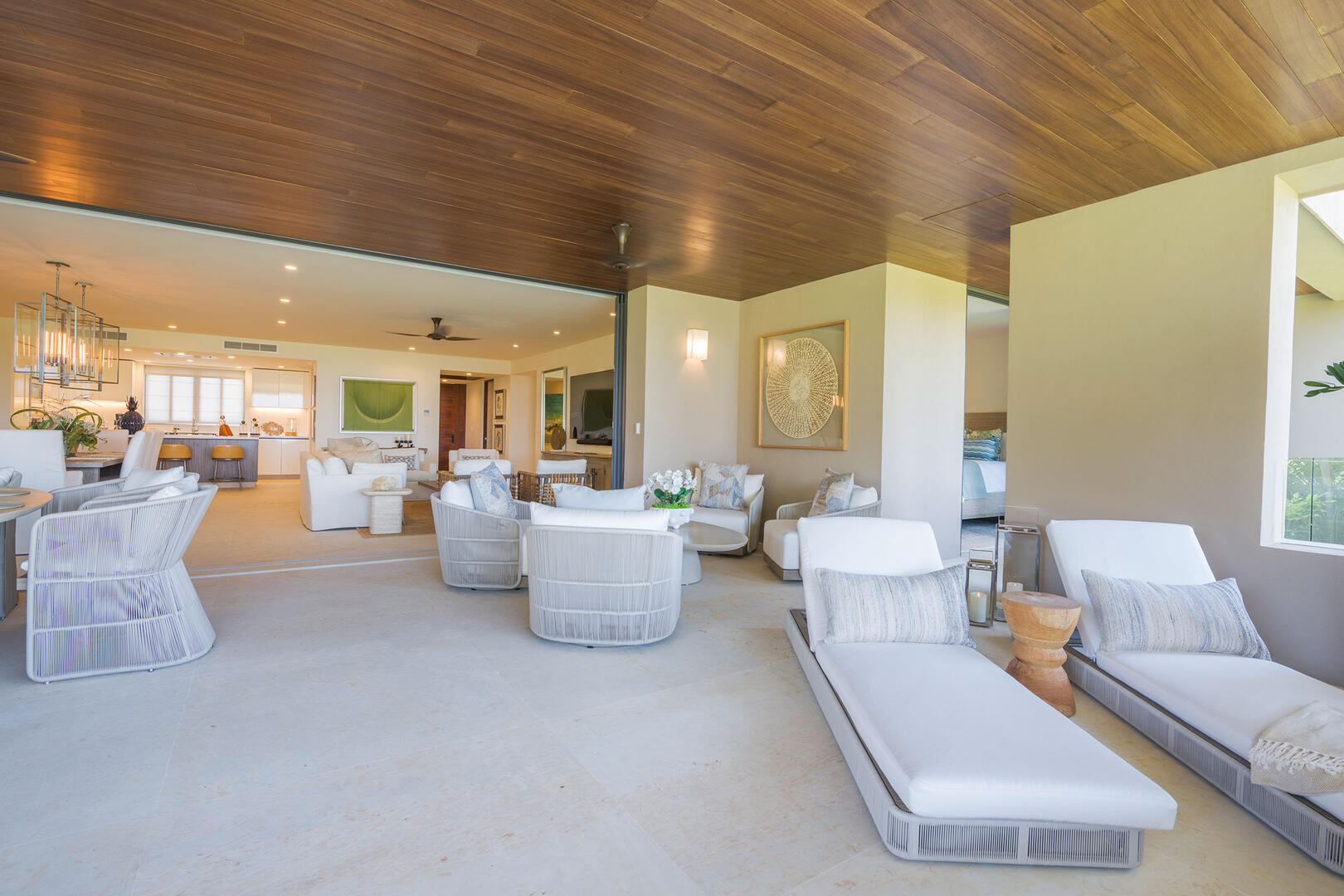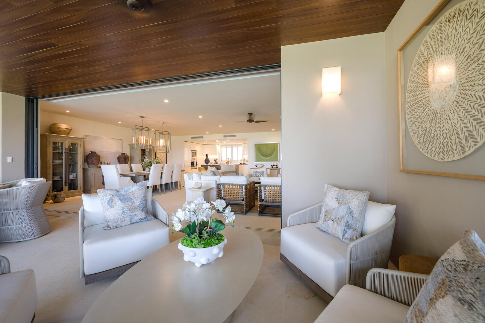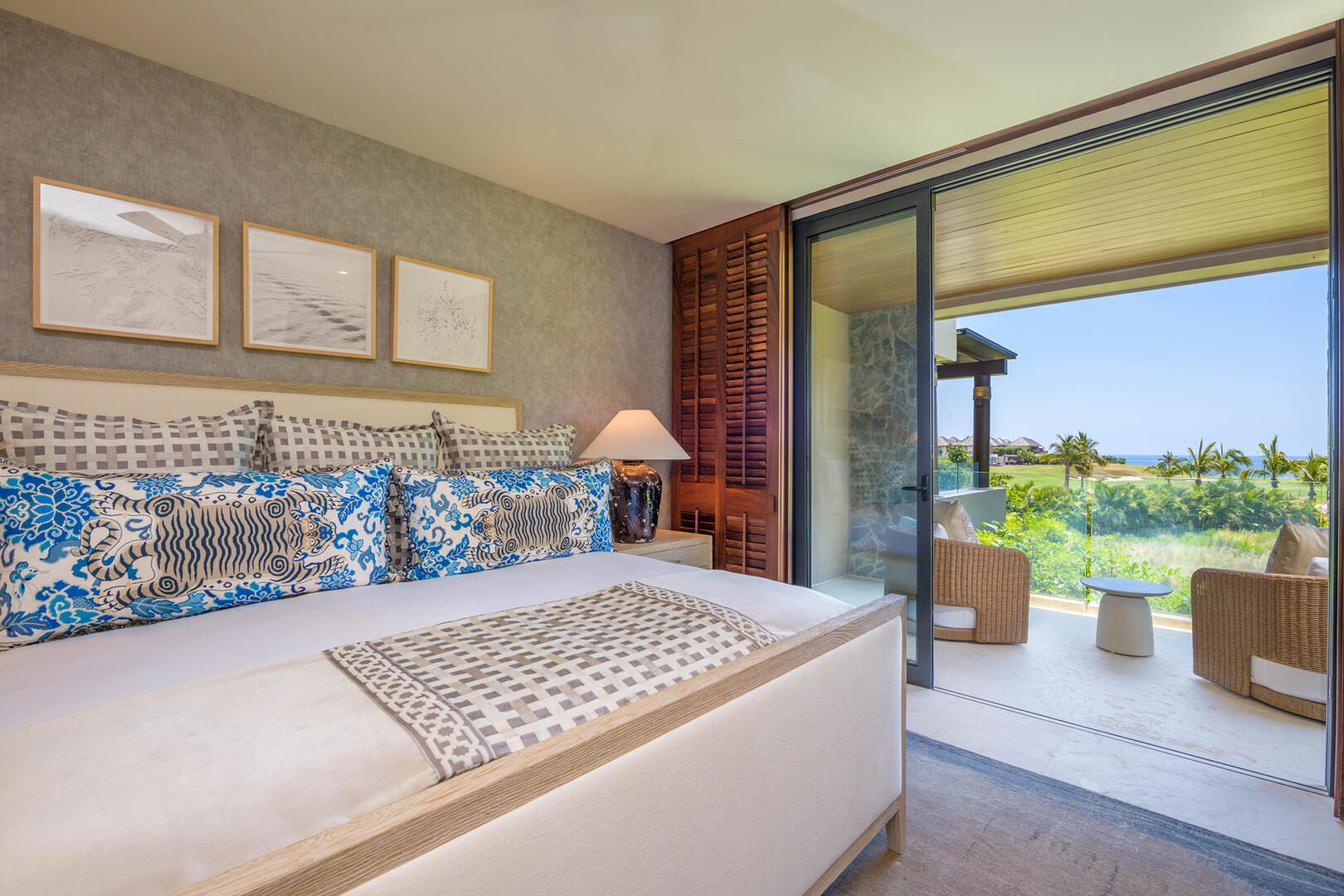 The covered terrace feels like a true extension of the condo's indoor space, accented by white furnishings, elegant décor and artwork. The four deck loungers sit right alongside the private plunge pool, positioned to take in some of the best views across the landscaped golf course and ocean beyond. Swim right up to the edge of your own private space, while the sheltered outdoor area extends to include enough room to house an outdoor dining table, a gas grill, and an outdoor kitchen, making it just as easy to dine al fresco as it is to dine indoors, all while soaking up the natural views and terrain of Punta Mita.