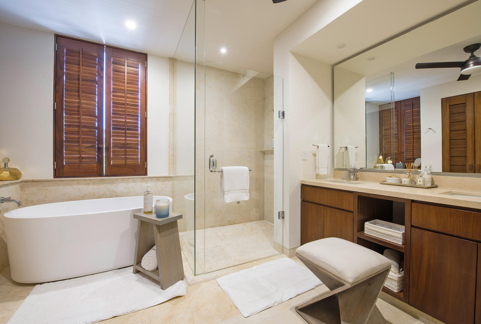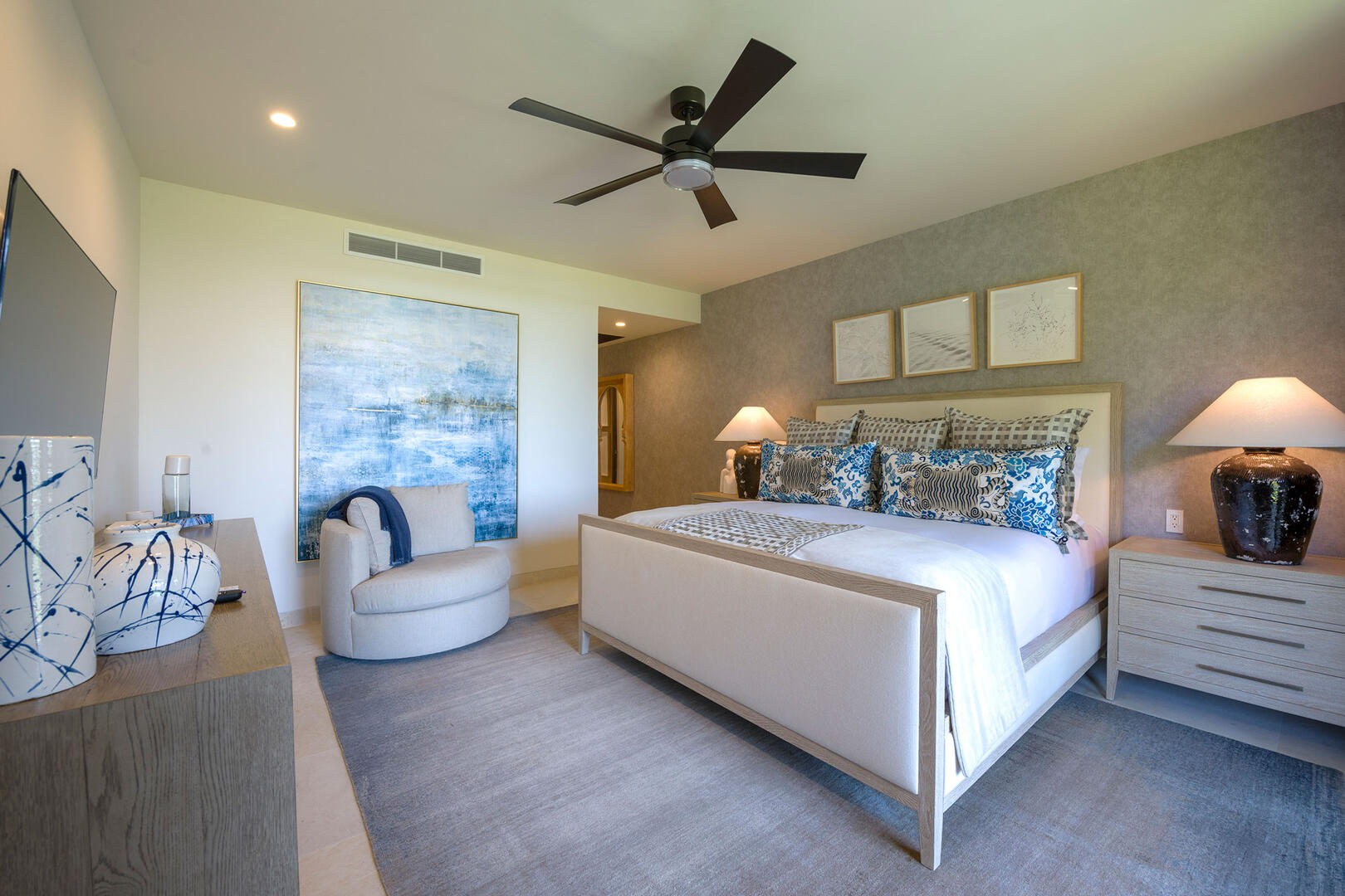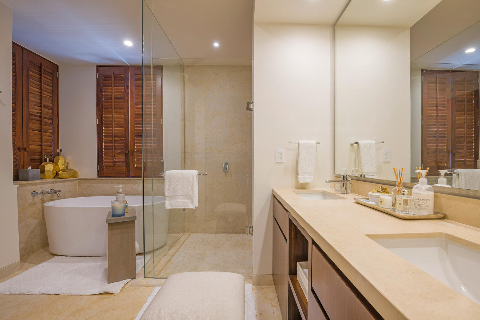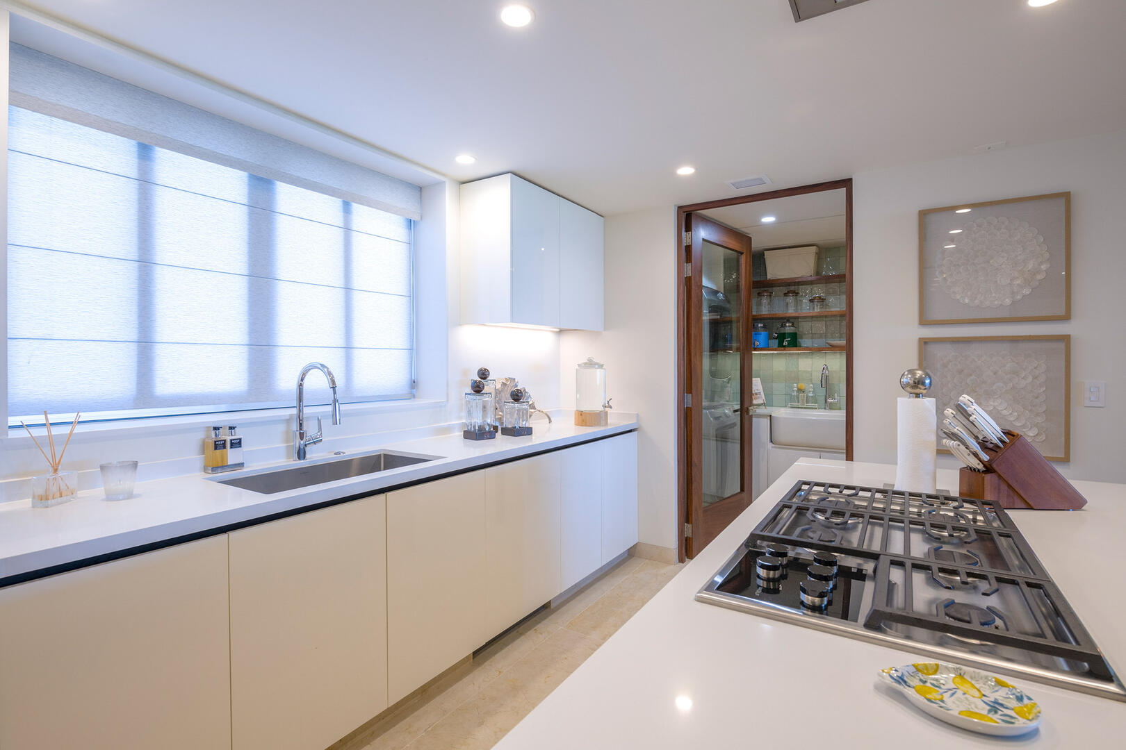 The covered terrace feels like a true extension of the condo's indoor space, accented by white furnishings, elegant décor and artwork. The four deck loungers sit right alongside the private plunge pool, positioned to take in some of the best views across the landscaped golf course and ocean beyond. Swim right up to the edge of your own private space, while the sheltered outdoor area extends to include enough room to house an outdoor dining table, a gas grill, and an outdoor kitchen, making it just as easy to dine al fresco as it is to dine indoors, all while soaking up the natural views and terrain of Punta Mita.