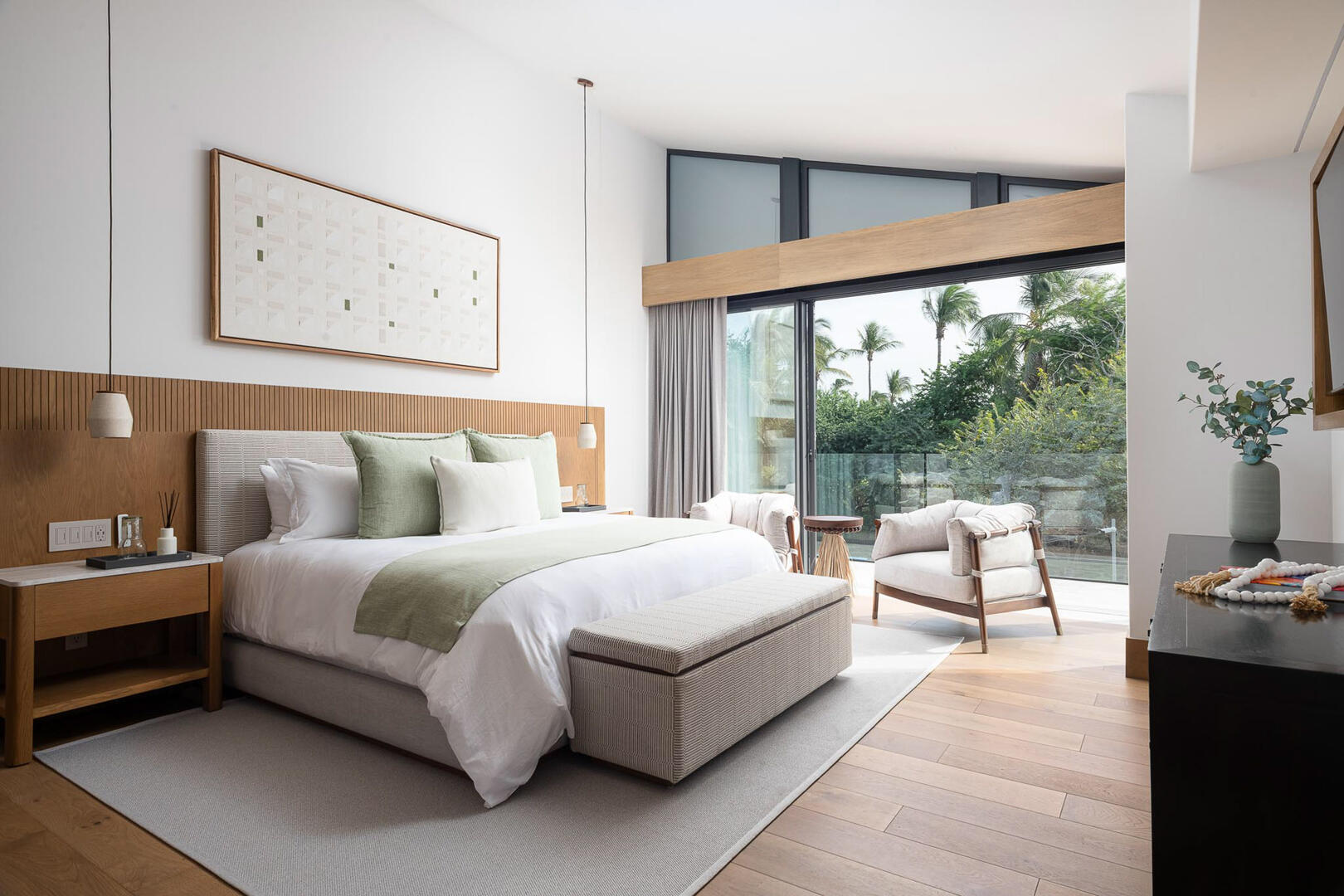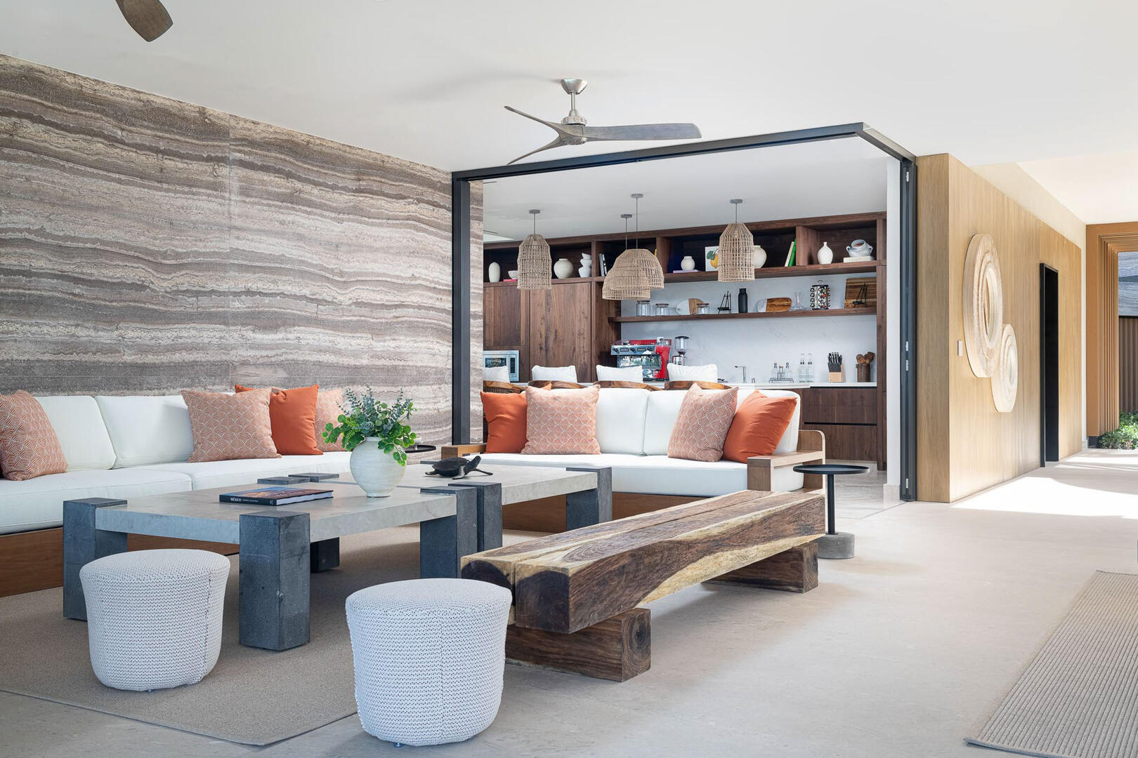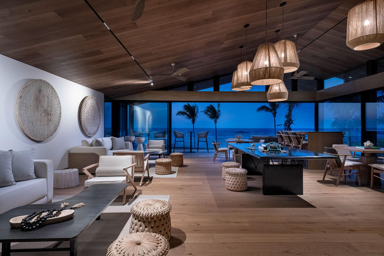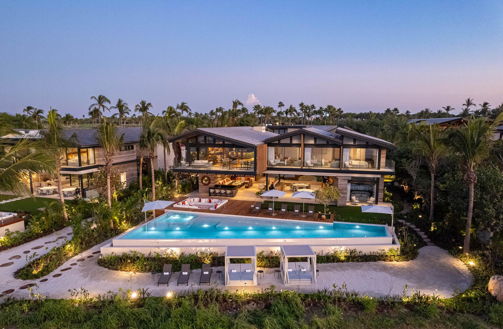 Elevated ceilings, garden and ocean views are all highlights of the private bedrooms, while a gourmet kitchen brings in island seating, rich wood cabinetry, an espresso machine, and a pizza oven. A media room and game room in the elevator home mean no shortage of entertainment and indoor things to do, from foosball to gaming tables, a pool table to the CAVA wine cellar, gym, and a relaxing home spa.