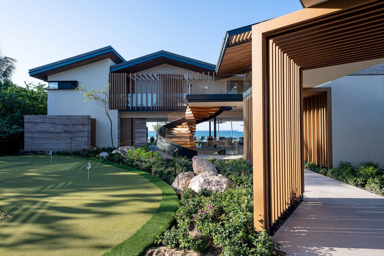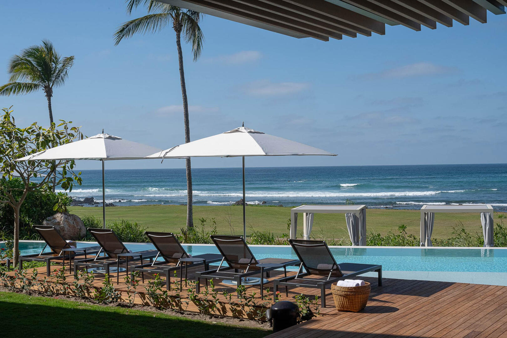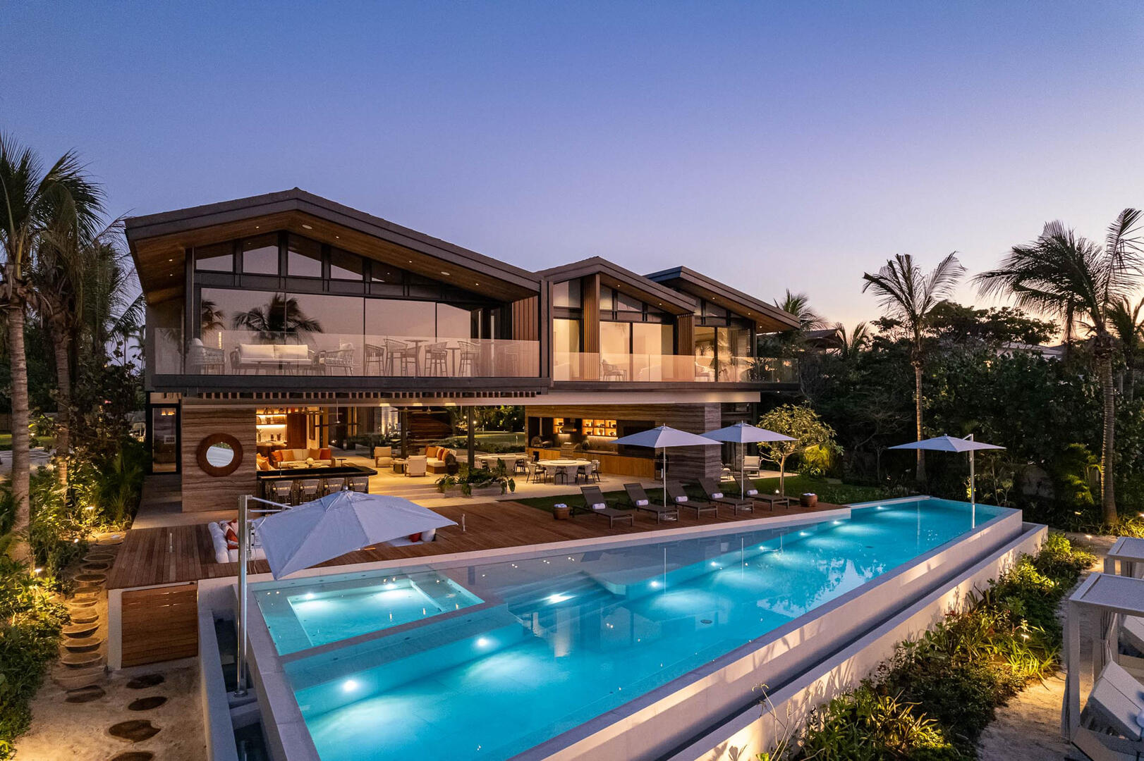 Just steps from the edge of the ocean and the famed Pacifico Golf Course, Punta Pacifico Sur exudes upscale luxury and grand inclusions. This eight-bedroom, 8.5-bath home is one of the larger rental properties on the peninsula, with enough space to comfortably house 18 guests amid an array of upscale delights. Two stories of sliding glass doors, glass-railed terraces and glass-rimmed walkways extend across the property, flanked by towering palm trees and lush tropical landscaping. Part of the exclusive Pacifico Estates collection in gated Punta Mita, Punta Pacifico Sur benefits from its close proximity to world-class golf and direct Pacific Ocean views.