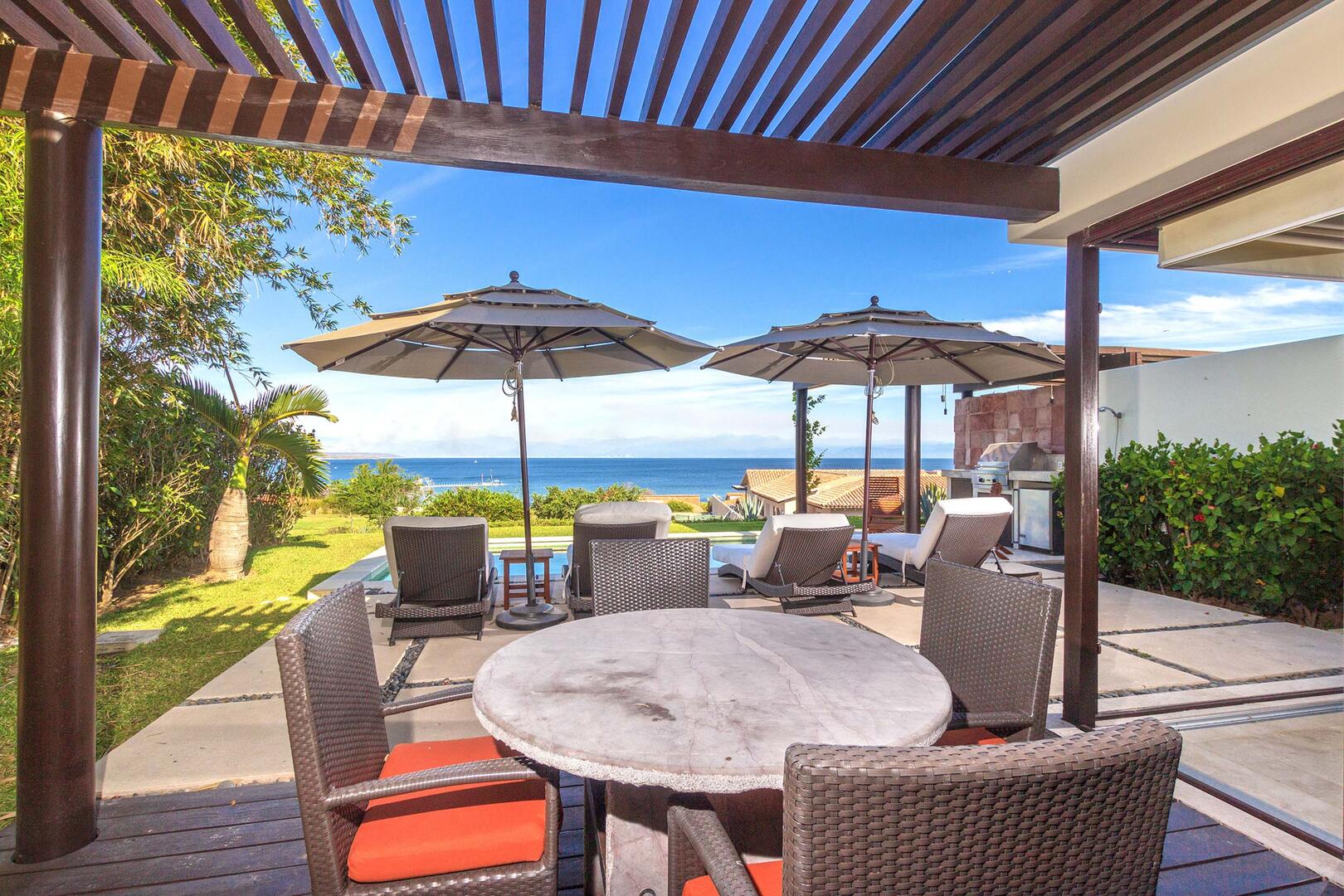 Step into the refreshing swimming pool while gazing directly upon passing vessels and sailboats in the water or simply relax poolside in one of the villa's six deck loungers. Surrounded by a grassy area, the outdoor space incorporates a gas grill and small fridge underneath a pergola at one end of the pool, and another pergola that's partially shading a small outdoor dining table for four. Head upstairs to take advantage of the top-level balcony for additional ocean views, a small seating and dining area, and even a Jacuzzi. The outdoor space is further complemented by the ease of an outdoor shower and the peacefulness of a cascading water wall.