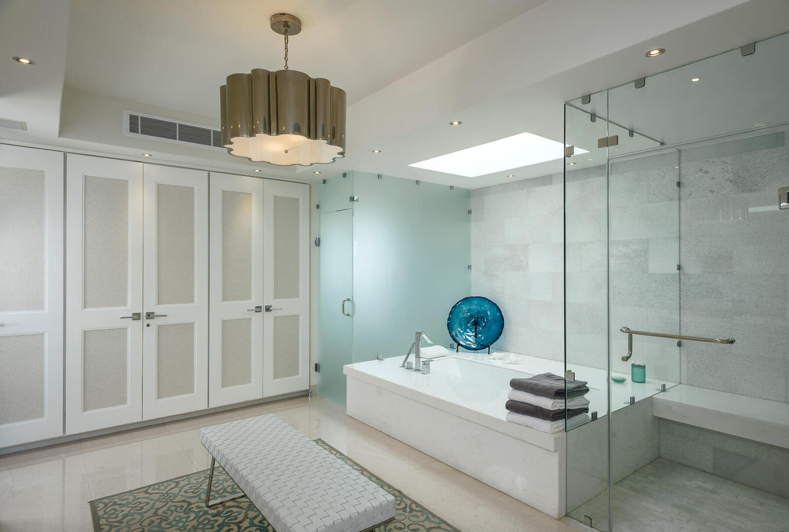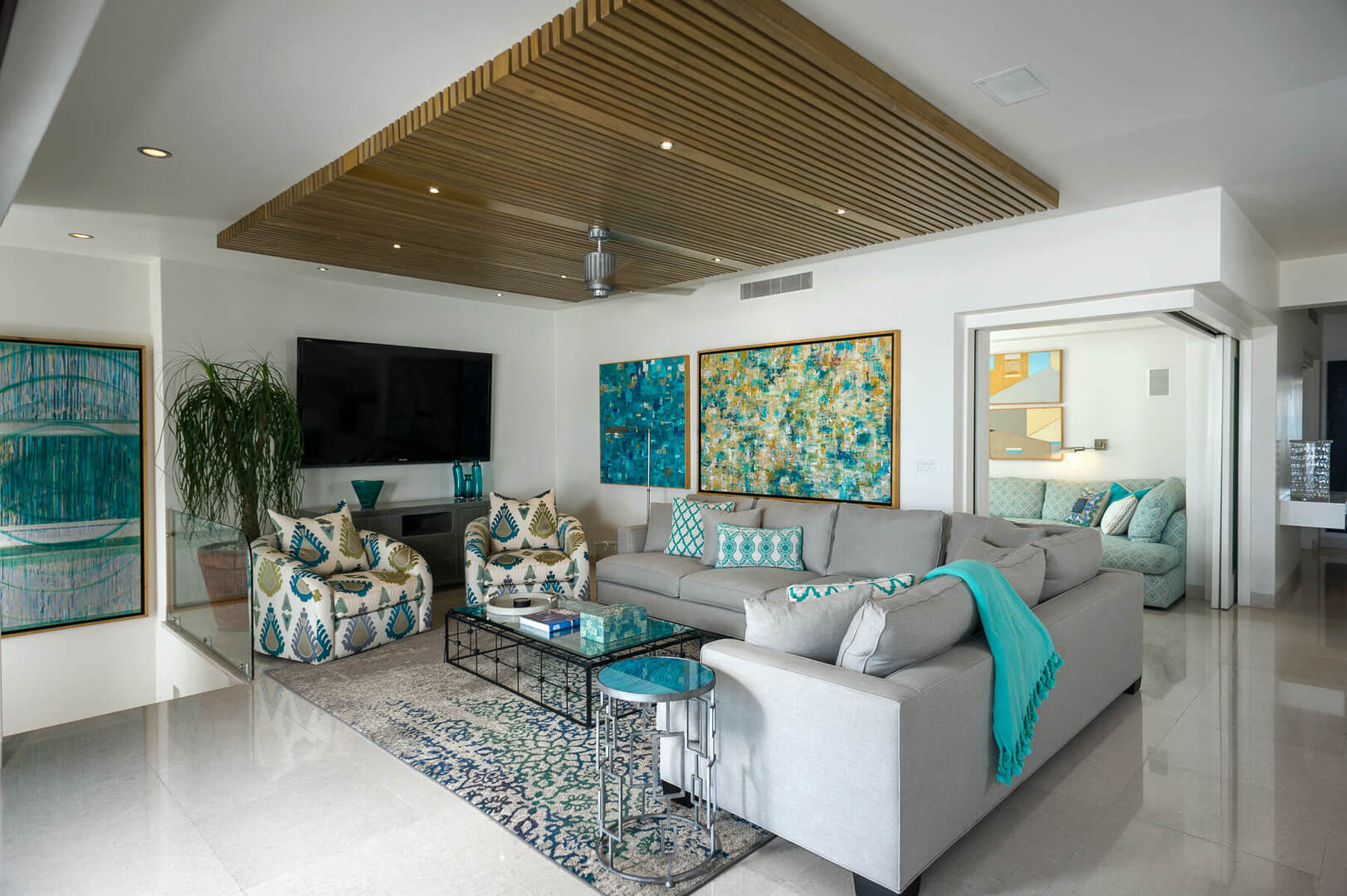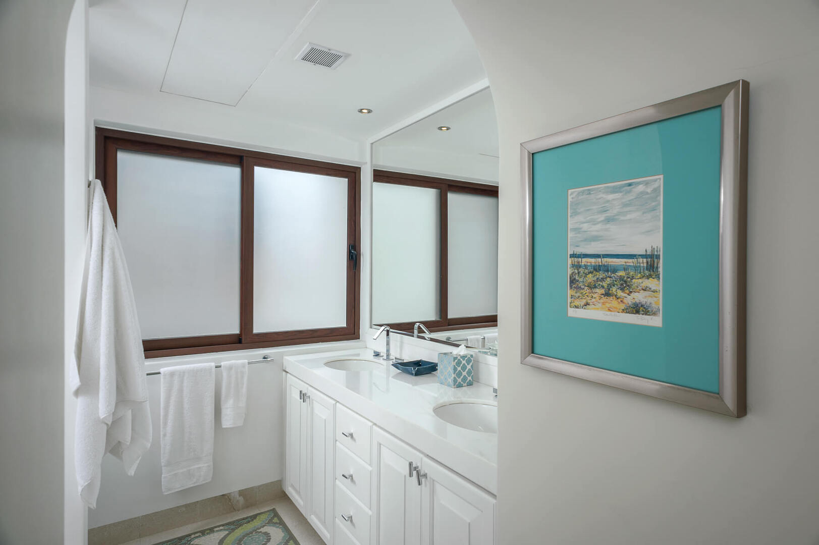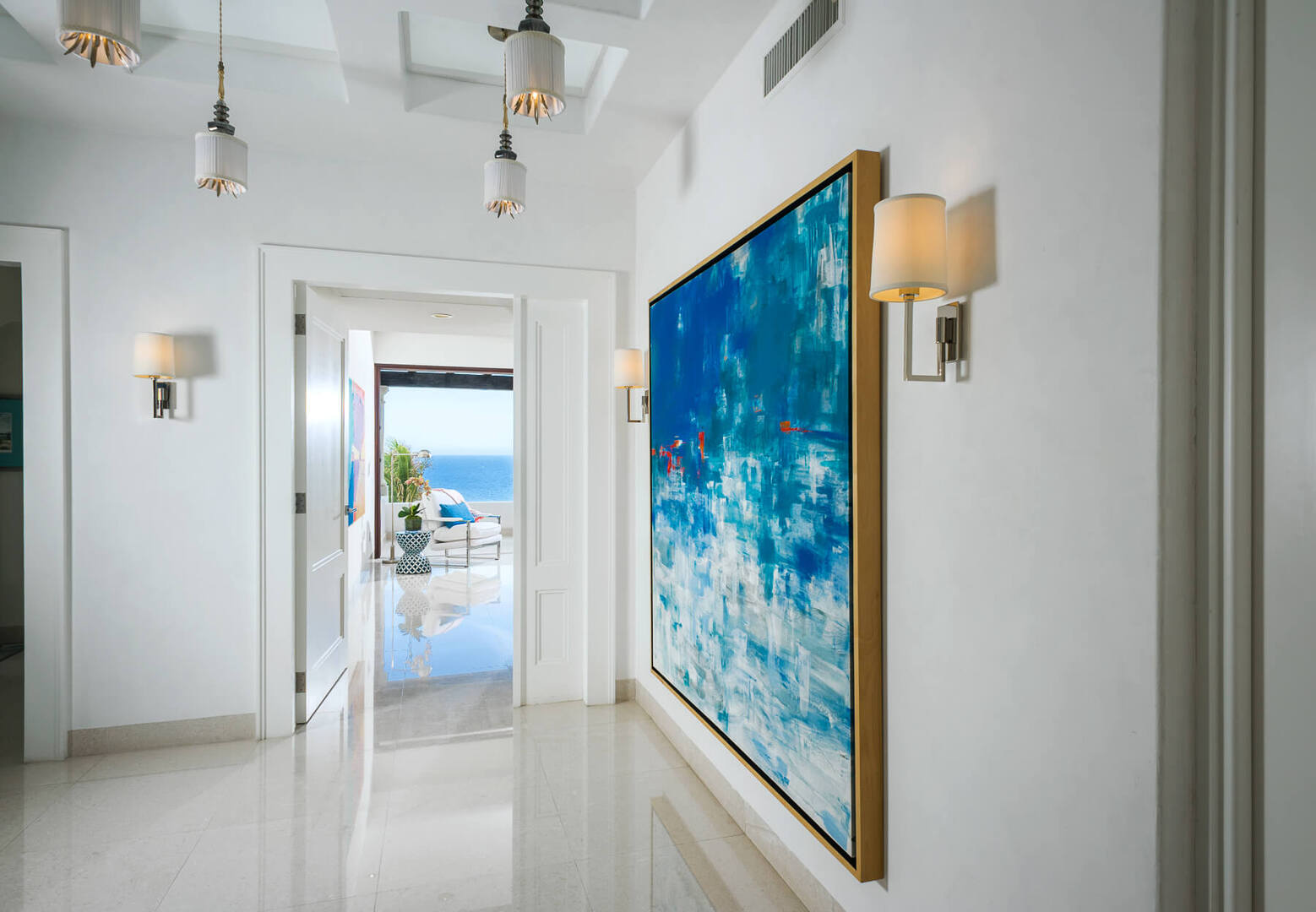Featuring a decor of modern taste, with plaster walls and floors in light shades offset by darker furnishings and coverings to create contrast, this home is a beautiful example of a luxury villa. Artwork is tasteful and accentuated by the absence of distraction offered by clean walls. All rooms are bright as they orient towards the ocean and utilize sliding recessed glass doors to open a space seamlessly from bedroom, or living room, to terrace and beyond.