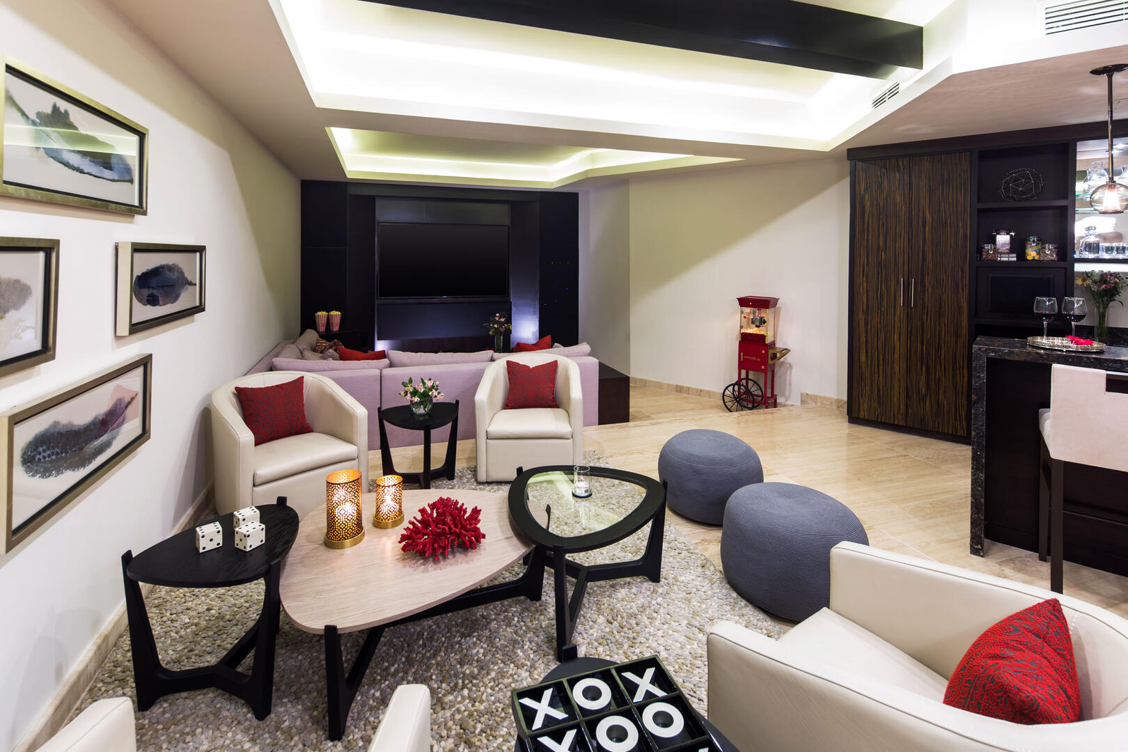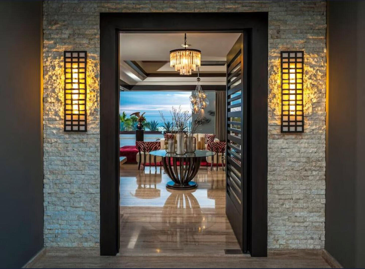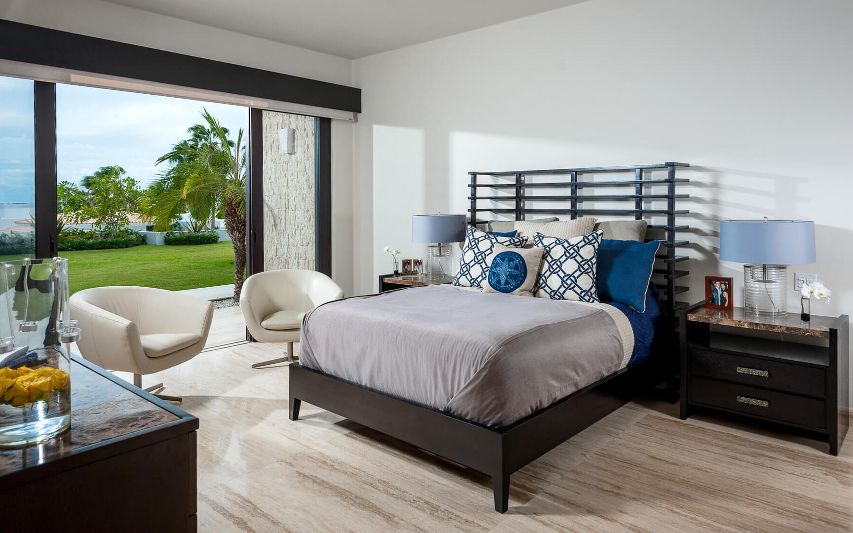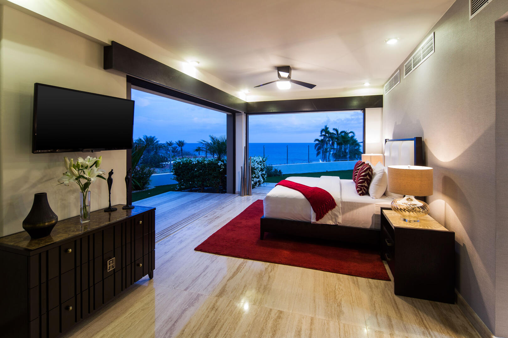 With a view of the pool terrace and ocean waves peeking through swaying palm trees, Villa Renata's ultra-luxe living area is a beautiful space that features designer decor and a chic wet bar and lounge. The home also has a media room with a massive flat screen and ample seating, as well as a separate study/office with a desk, sofa, and coffee table where guests can work or relax. Pocket doors throughout the home disappear to reveal stunning ocean views and allow warm sunlight and fresh sea breezes to fill every room.