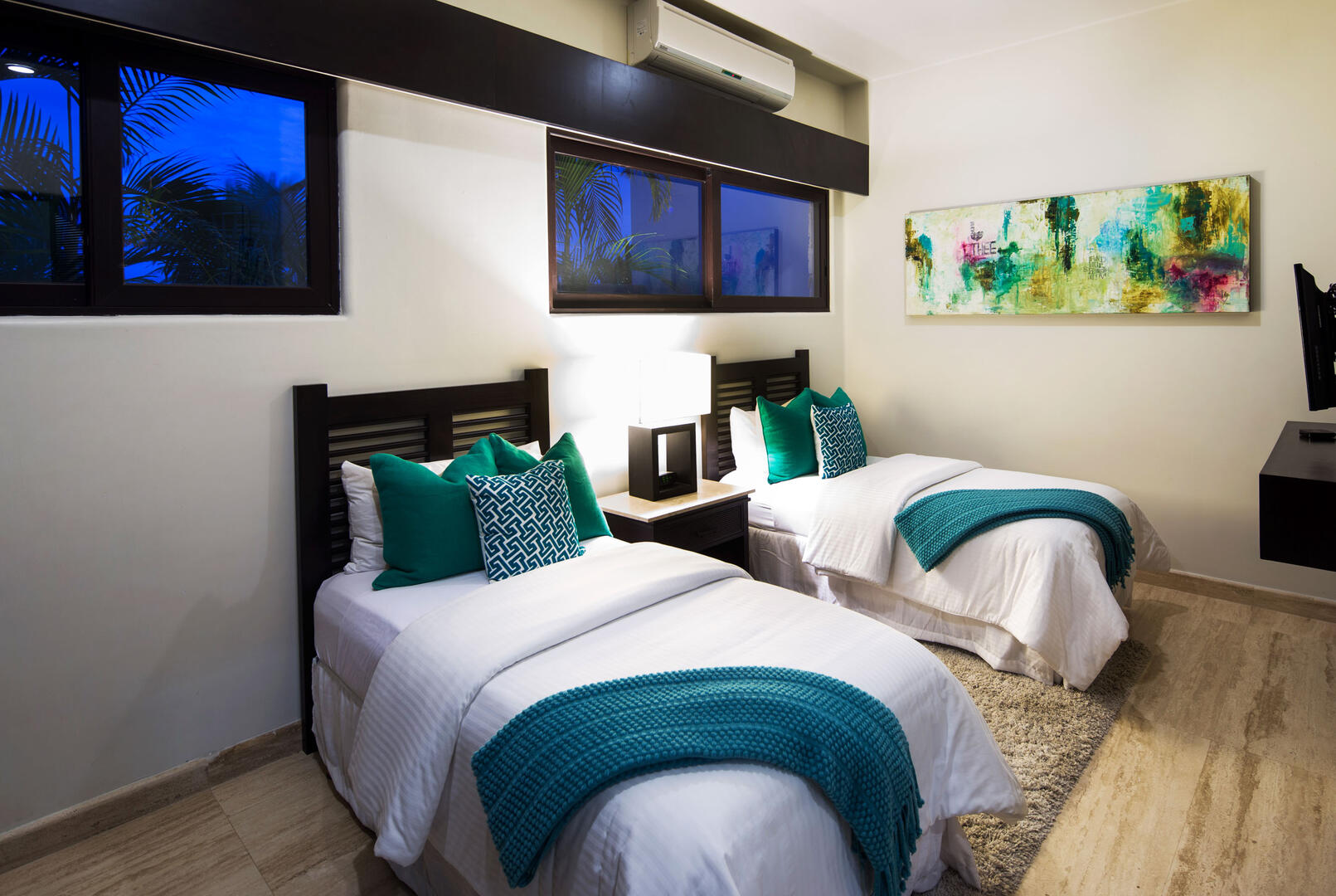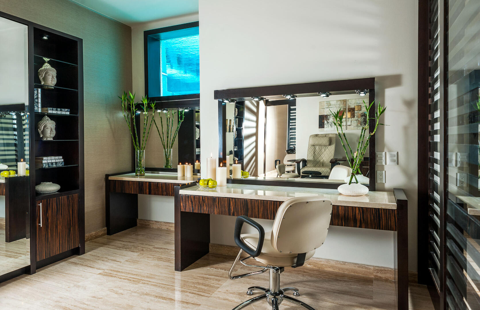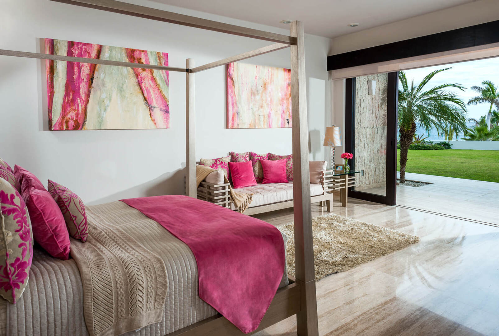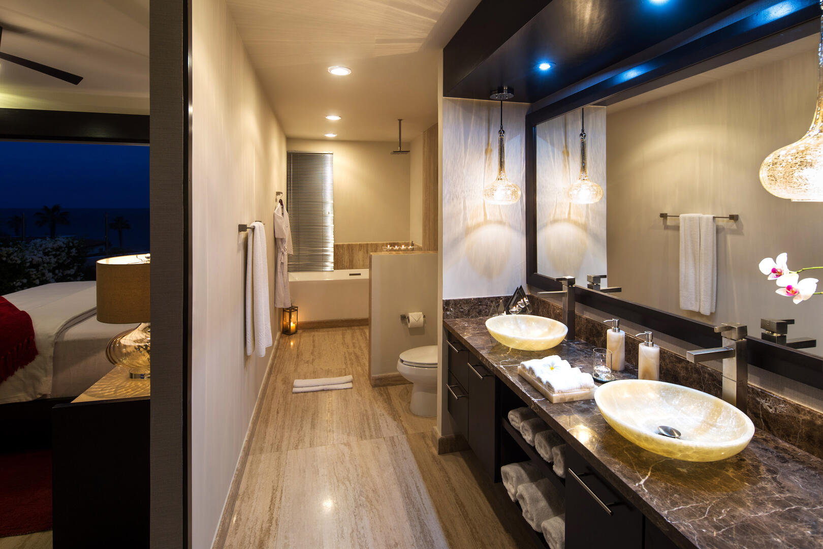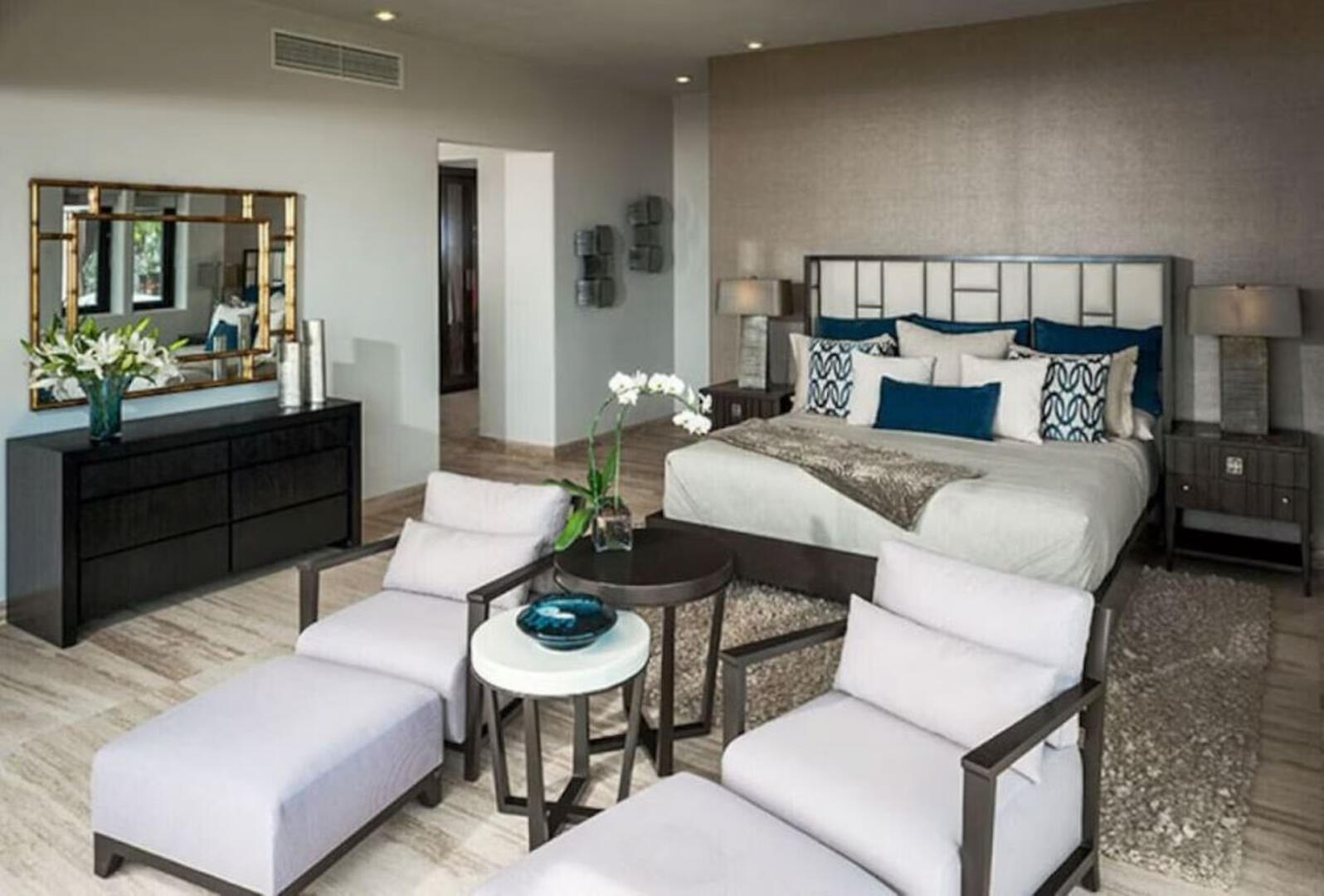 Crisp white walls and silky cream-toned flooring allow the impressive art pieces, playful pops of animal print, and vibrant accent colors in the decor to be the center of attention in every room. Each of Villa Renata's seven beautifully decorated bedroom suites has a soothing ambiance with soft tones, plush beds, and luxurious linens. Gorgeous beyond compare, the master suite has a King bed, private lounge area, and amazing views of the Cortez, with an ensuite bath that includes features like delicately coated glass teardrop fixtures, floating sinks, and a freestanding tub next to a window looking out to the ocean. For even more indulgence, guests can unwind in the sauna and steam room and then be pampered with in-villa spa services in the comfort of Renata's very own spa suite, complete with salon chairs, a mani/Pedi station, and massage bed.