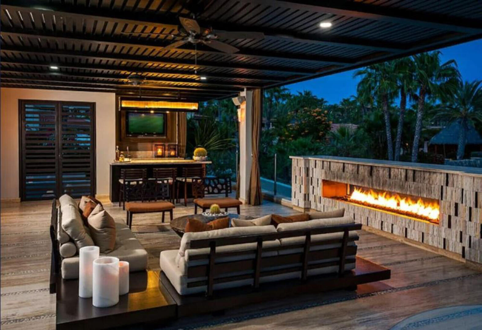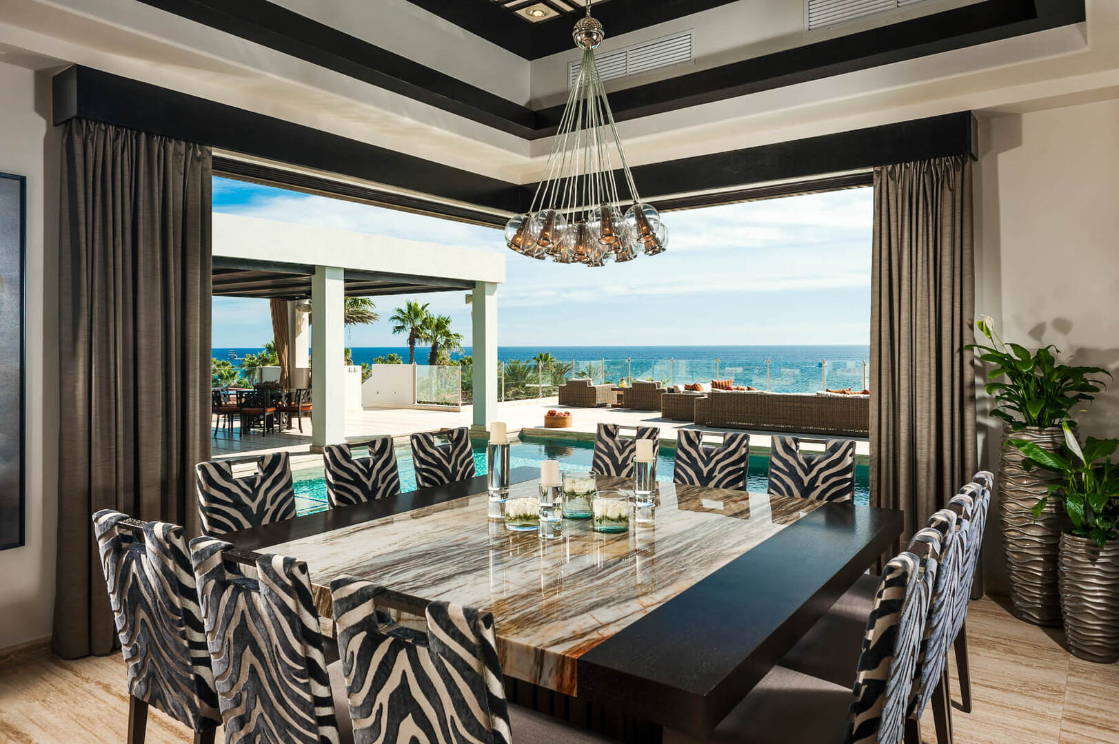 Uniting beauty and functionality, Villa Renata's gourmet kitchen features a sleek, modern design, complete with premium Viking appliances, dark wood cabinets, elegant white marble countertops, and a marble-topped island with breakfast bar seating. Wood panel privacy screens around the dining room provide an intimate setting to enjoy a delicious sunset meal overlooking views of the glistening Sea of Cortez. Linger at the table and watch the stars come out and the moonlight reflects off the waters of the pool. A floating walkway just beneath the pool's surface leads from the dining room across to a covered outdoor lounge area where a casual dining table, sofas, chairs, and massive outdoor fireplace create a cozy spot to sip cocktails in the evening.