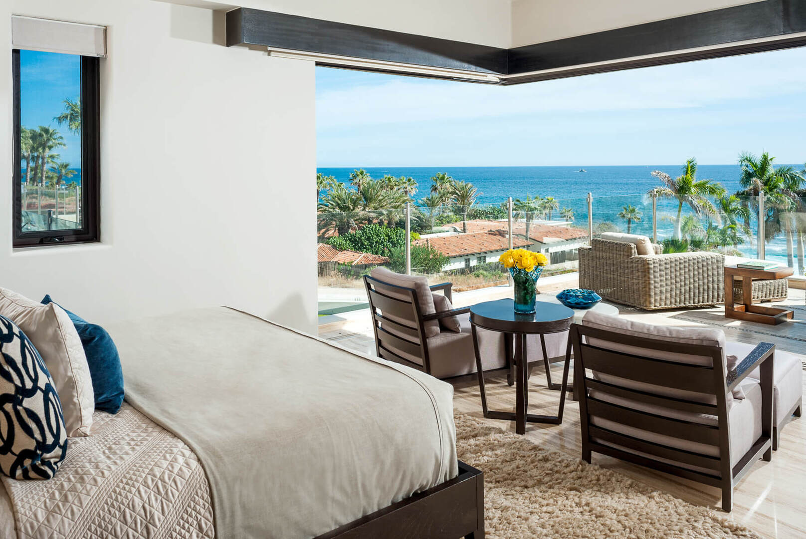 The rooftop terrace at Villa Renata is true perfection in design. In addition to the large fireside lounge and dining area, a series of lounge beds and chairs stretches across the terrace with a blazing fire pit as its centerpiece. Plexiglas barriers allow for unobstructed ocean views, and a small privacy hedge of blue agave brings a bit of desert ambiance to the terrace, enhancing the natural beauty that surrounds the home. The rest of the terrace is dominated by Renata's exquisite pool which extends to the edge of the exterior spaces - flowing like a moat along with the living and dining areas of the home. A hidden Jacuzzi bubbles away at the far end of the pool, welcoming a relaxing sunset soak, and the fire pits begin to glow, bathing the terrace in warm light.