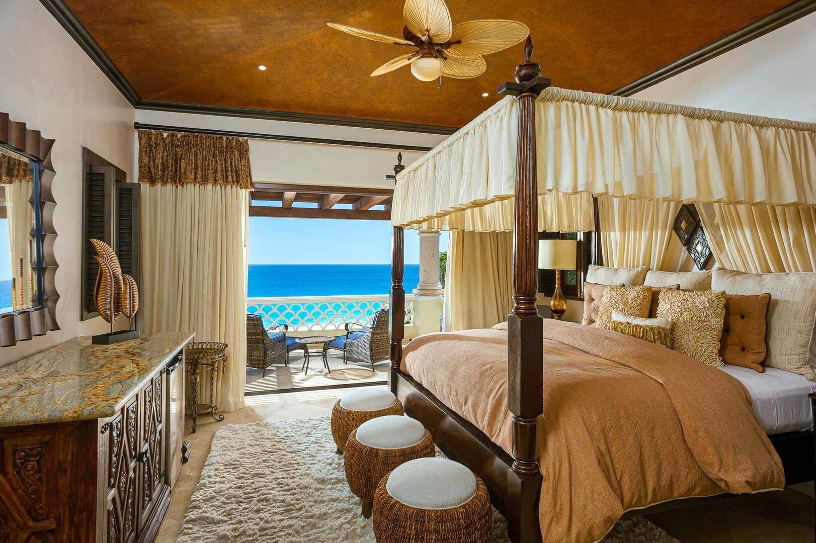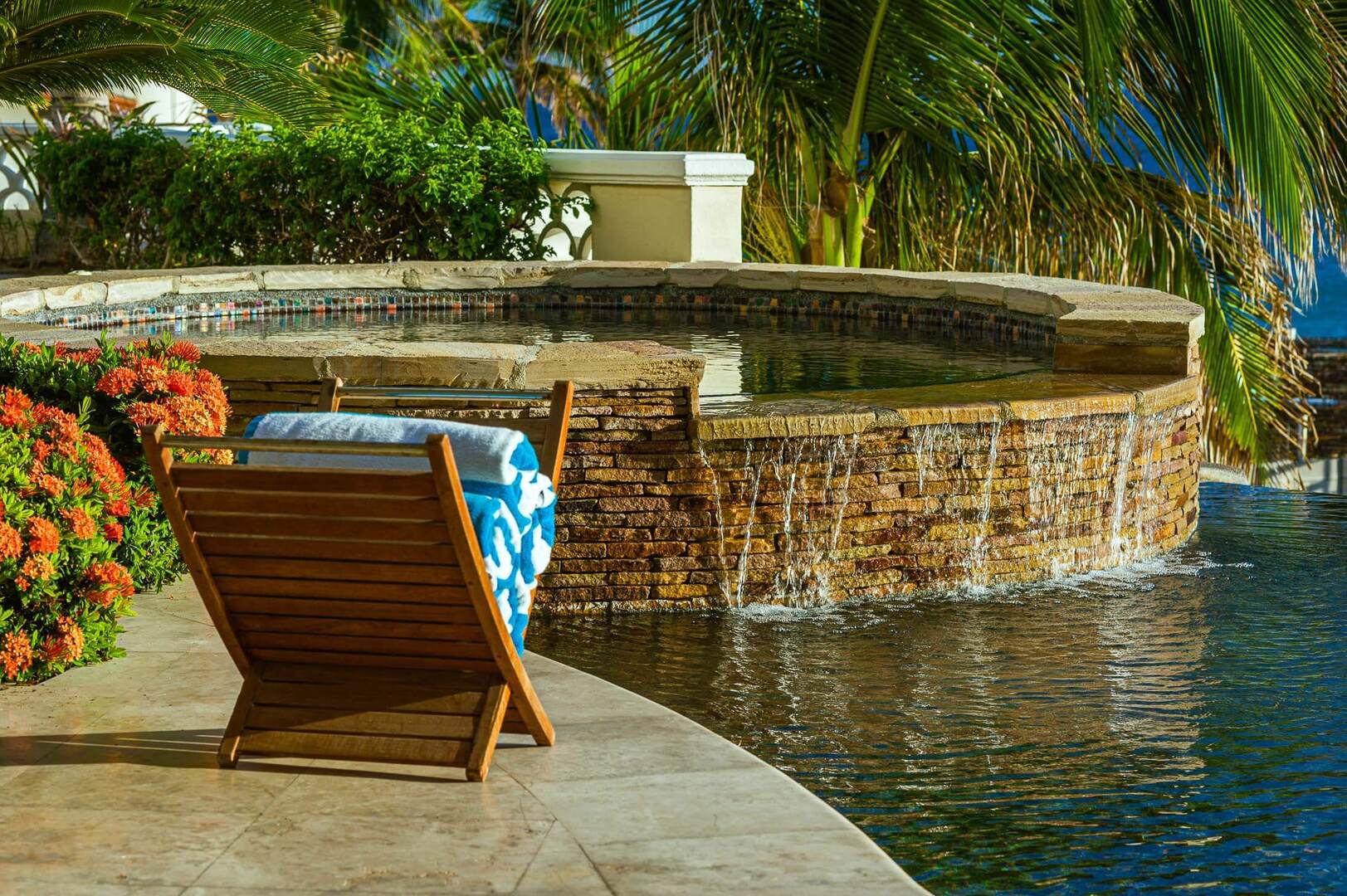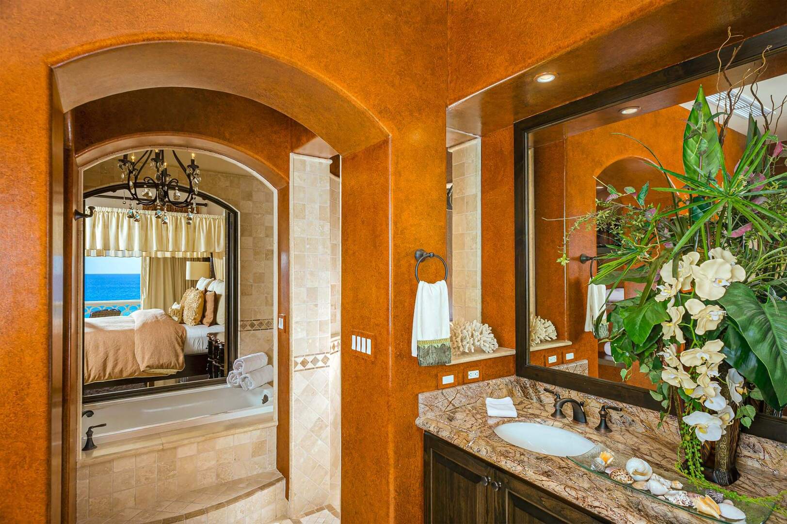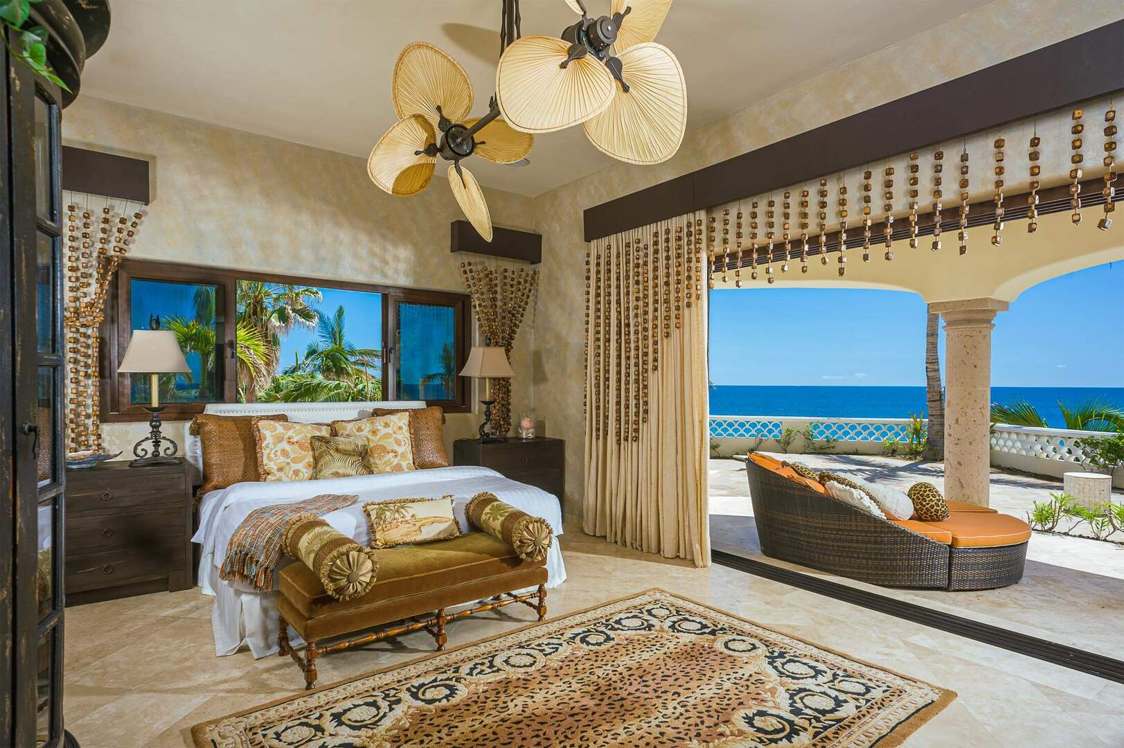 Sit back and relax in the sunken fire pit, right in the middle of the home's sparkling swimming pool with ocean views. The pool area has recently been upgraded with glass partitions making the pool area ultra safe for the little ones. The outdoor space also adds in a Jacuzzi, a shaded palapa with room for grilling, and some elegant outdoor dining and lounge space, including your own private waterfall. Private terraces with ocean views accent many of the home's five ensuite bedrooms, providing the perfect, secluded spot to take in the beauty of the surrounding area as the sun comes up or sets for the day.