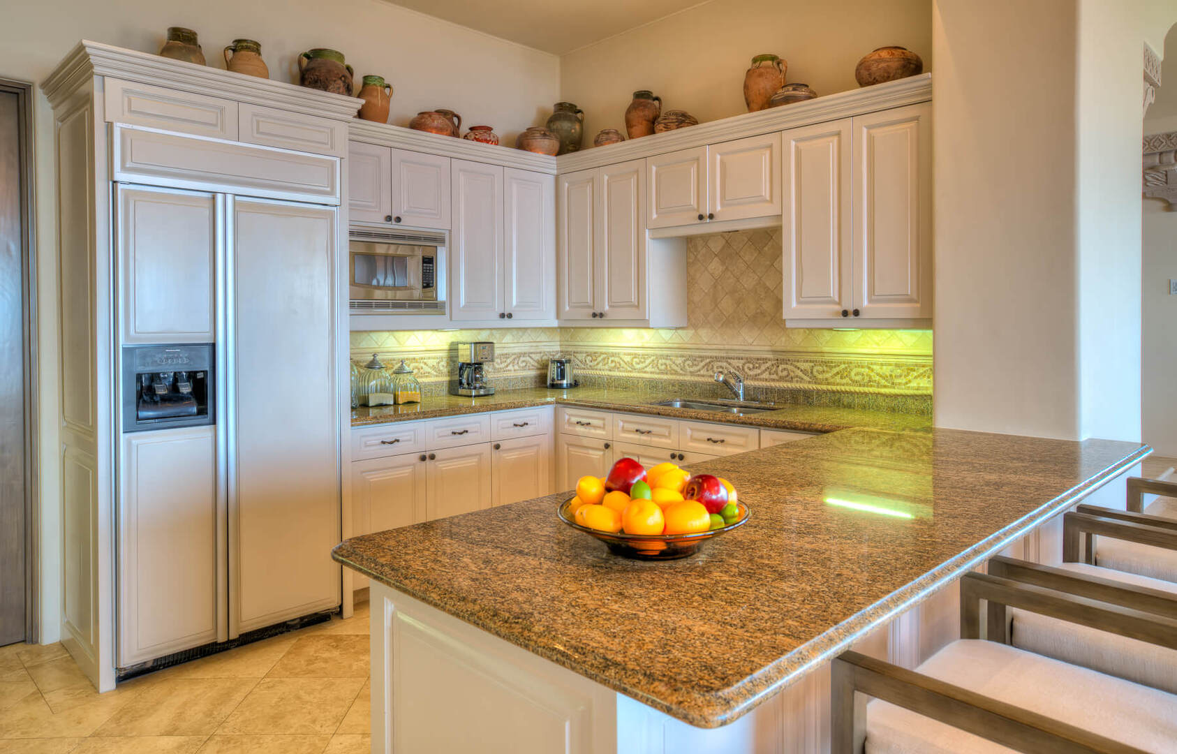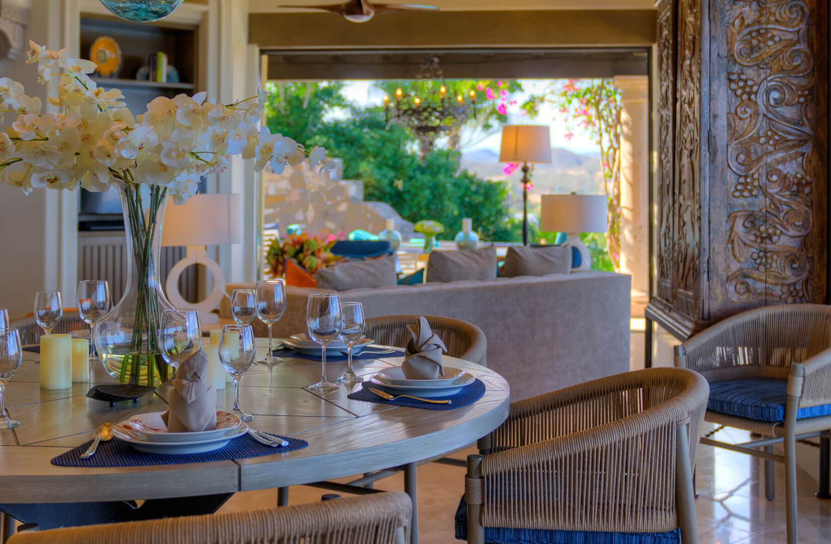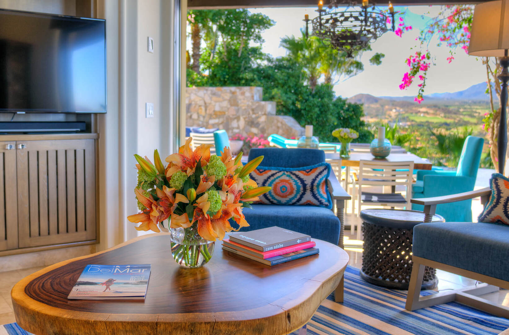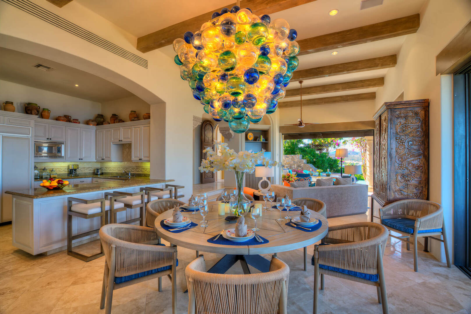 A spacious and modern open-concept living and dining area is one of the many places where you and your guests can relax and gather together after a long day of adventuring through Cabo. Watch a movie in the living area or dine beneath a unique and colorfully designed chandelier at a round dining table, with seating for 8 guests. In the kitchen, you will find professional appliances for you to use to sharpen your culinary skills or create a gourmet meal.