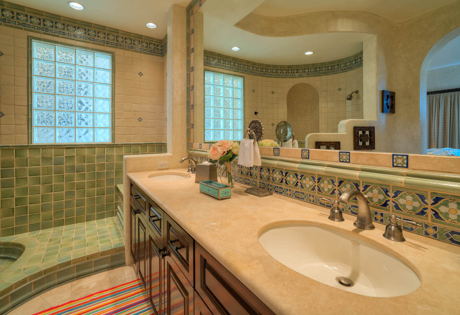 Each of the four bedrooms is an escape of its own. Although all are outfitted with lavish linens and plush pillows in rustic but vibrant colors, 3 of Casita 48's bedrooms feature a balcony where panoramic views of the Pacific can be enjoyed from the comfort of several seating areas. The fourth bedroom opens out onto the villa's terrace where you can appreciate the glittering azure waves from one of the several lounge chairs. The three bedrooms found on the second floor each have their own King size bed, while the fourth bedroom on the ground floor includes 2 Double beds.
